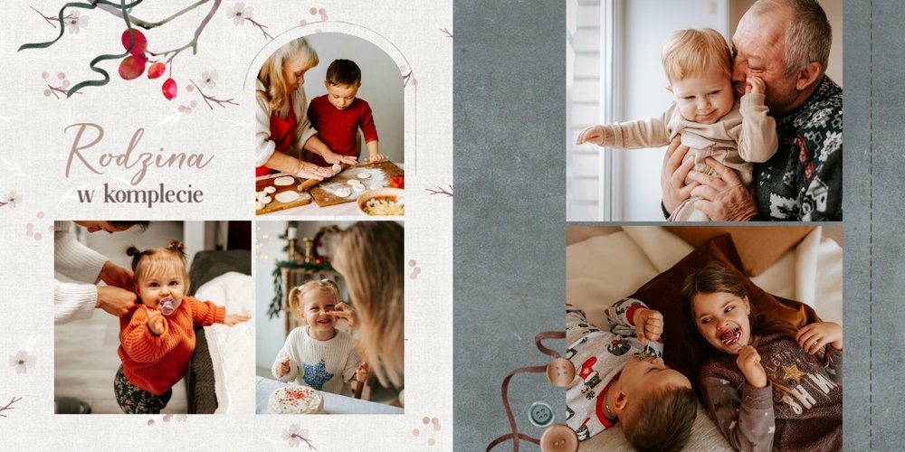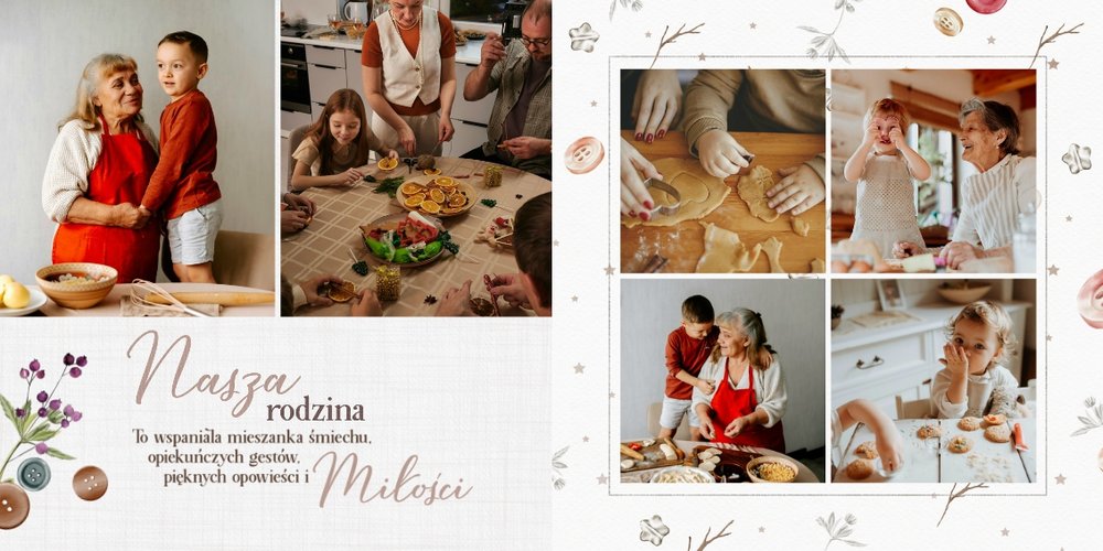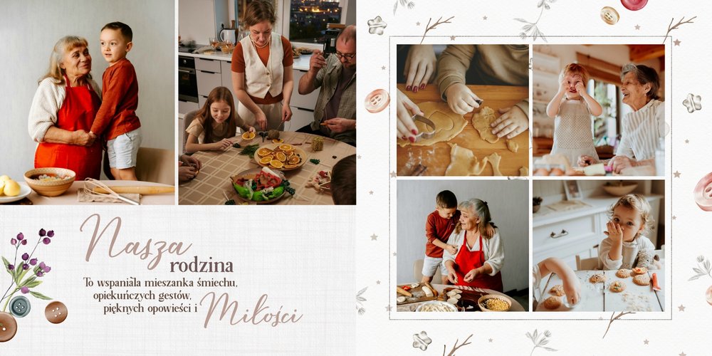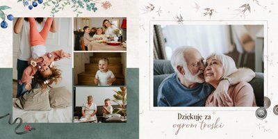 Szablon jest pełen uroku - każda strona posiada układ komórek zdjęciowych, przyozdobionych delikatnymi, kolorowymi rysunkami. Ozdobne tła i ilustracje w stylu boho i vintage idealnie współgrają ze zdjęciami Twojego dziecka. Wśród ilustracji wplecione zostały krótkie, czułe teksty, oddające wdzięczność i uczucia, które kierujemy do Babci i Dziadka. Szablon fotoalbumu "Na Dzień Babci i Dziadka" można swobodnie modyfikować, tak aby móc stworzyć spersonalizowaną pamiątkę od wnuków. To pomysł na prezent, który wzruszy każdą obdarowaną nim osobę, a zawarte w nim fotografie pozostaną z Wami na lata.