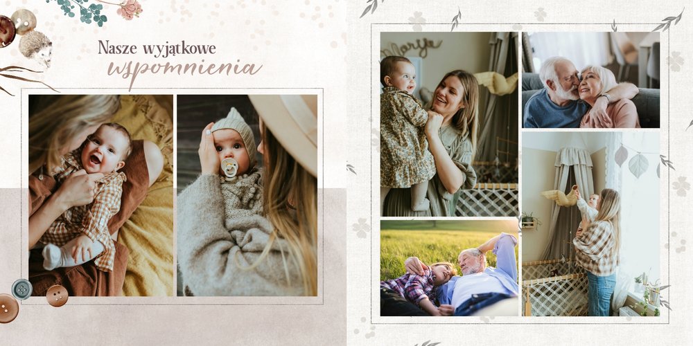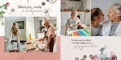 Szablon jest pełen uroku - każda strona posiada układ komórek zdjęciowych, przyozdobionych delikatnymi, kolorowymi rysunkami. Ozdobne tła i ilustracje w stylu boho i vintage idealnie współgrają ze zdjęciami Twojego dziecka. Wśród ilustracji wplecione zostały krótkie, czułe teksty, oddające wdzięczność i uczucia, które kierujemy do Babci i Dziadka. Szablon fotoalbumu "Na Dzień Babci i Dziadka" można swobodnie modyfikować, tak aby móc stworzyć spersonalizowaną pamiątkę od wnuków. To pomysł na prezent, który wzruszy każdą obdarowaną nim osobę, a zawarte w nim fotografie pozostaną z Wami na lata.