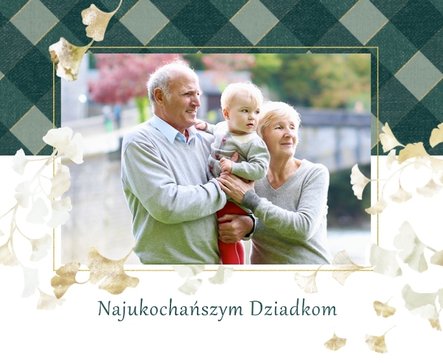 Szablon "Najukochańszym Dziadkom" to oryginalna kompozycja - połączenie ciemnej i eleganckiej kratki oraz wielobarwnego miłorzębu. Całość szablonu jest bardzo gustowna, co z całą pewnością przypadnie do gustu kochanym Dziadkom i idealnie wpasuje się w najzwyklejsze zdjęcia, również te z Twojego telefonu.