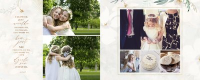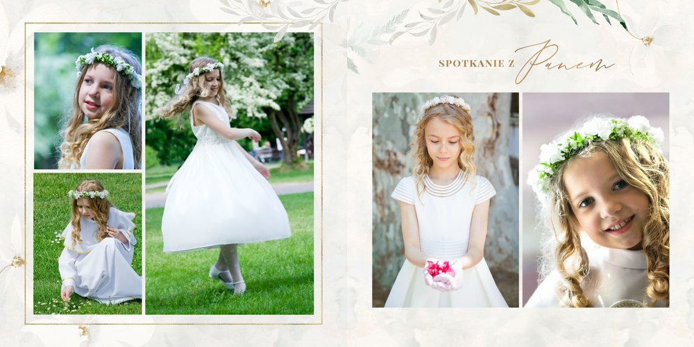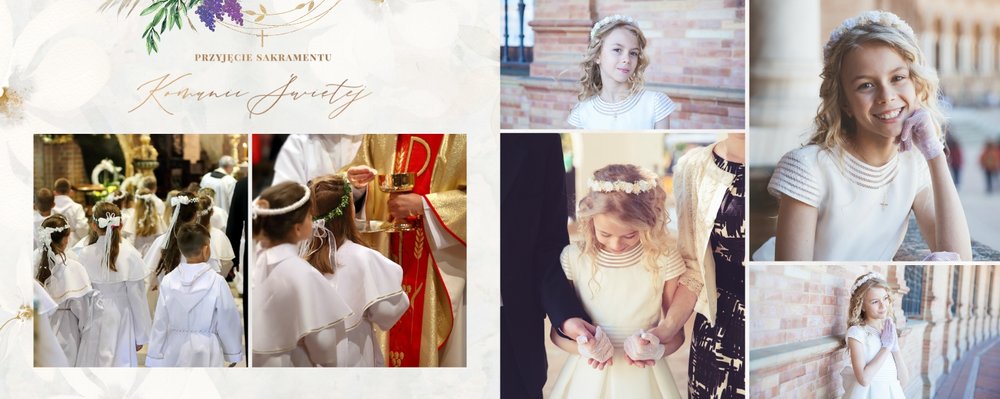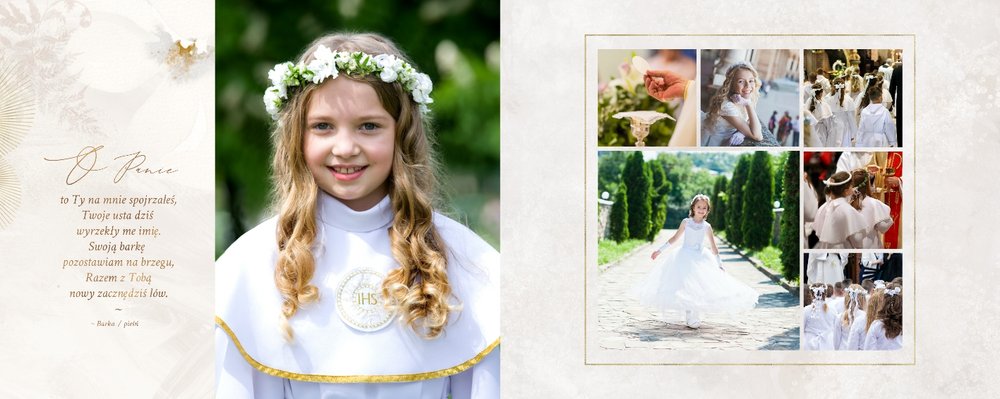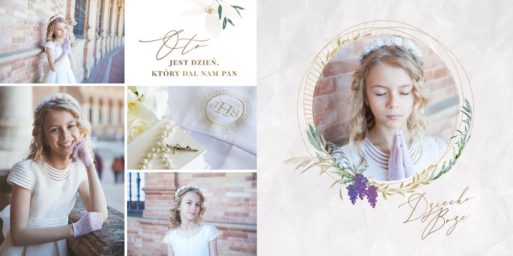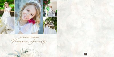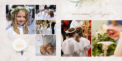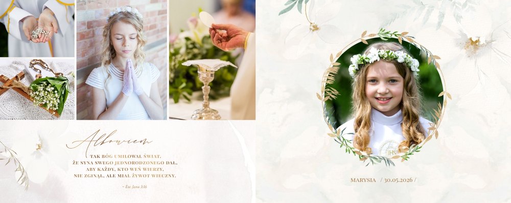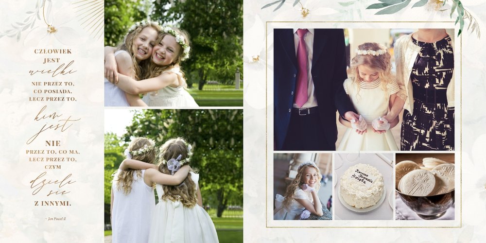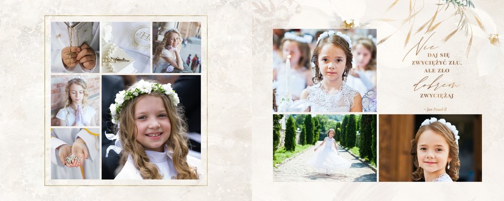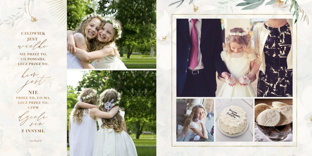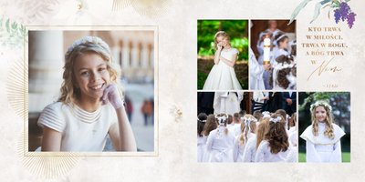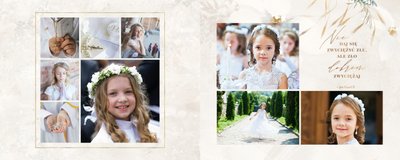 Szablon "Pamiątka I Komunii Świętej" tworzy zbiór wspomnień z wyjątkowego dnia sakramentu przyjęcia pierwszej eucharystii. Pozwala w elegancki sposób nie tylko zachować zdjęcia, ale i upamiętnić wszystkie ważne informacje związane z ceremonią. W szablonie nie brakuje również wzniosłych cytatów i sentencji sakralnych, które podkreślają wagę wydarzenia.