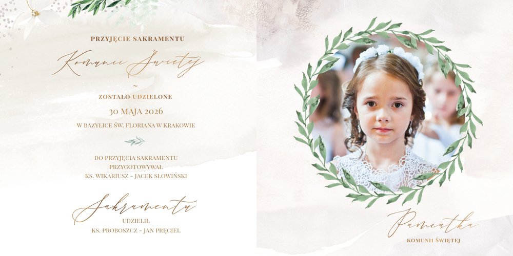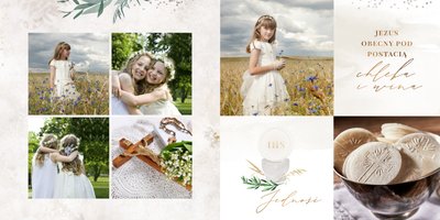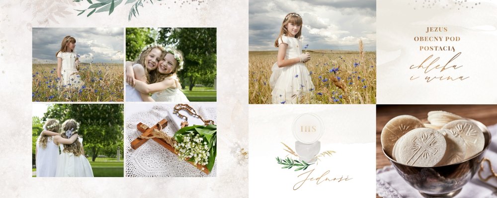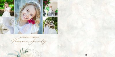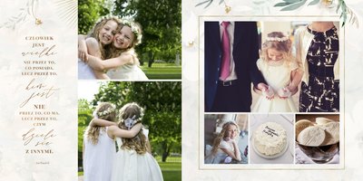 Szablon "Pamiątka I Komunii Świętej" tworzy zbiór wspomnień z wyjątkowego dnia sakramentu przyjęcia pierwszej eucharystii. Pozwala w elegancki sposób nie tylko zachować zdjęcia, ale i upamiętnić wszystkie ważne informacje związane z ceremonią. W szablonie nie brakuje również wzniosłych cytatów i sentencji sakralnych, które podkreślają wagę wydarzenia.