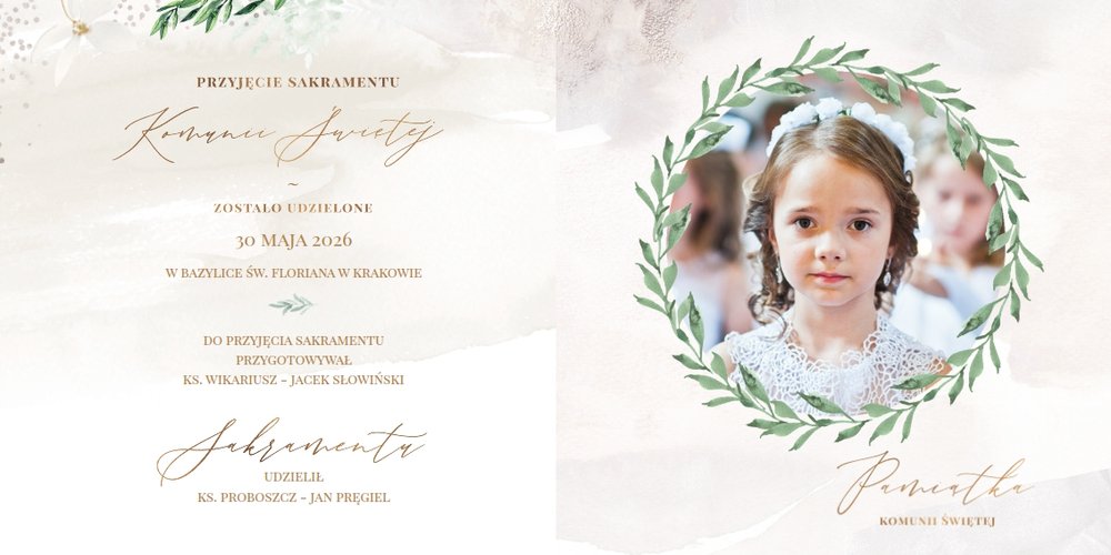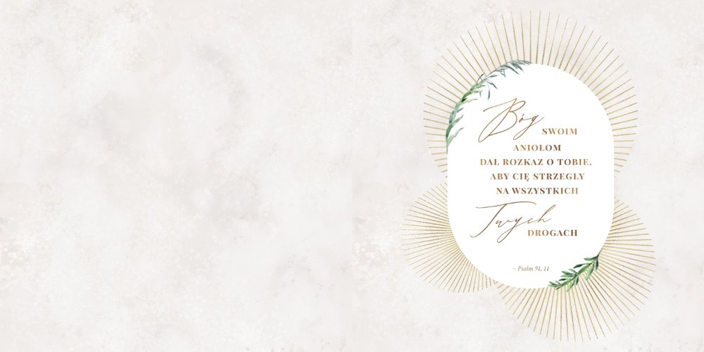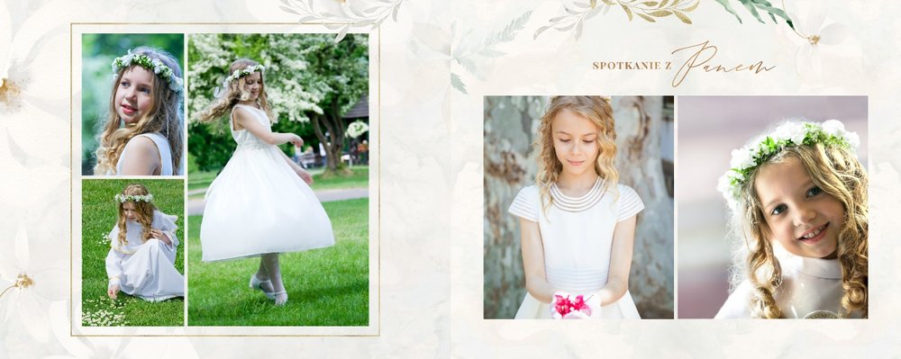 Delikatna, kremowa kolorystyka szablonu stanowi idealną bazę dla zdjęć z uroczystości. Uzupełnieniem oprawy graficznej fotoalbumu są złote ornamenty i subtelne motywy roślinne.