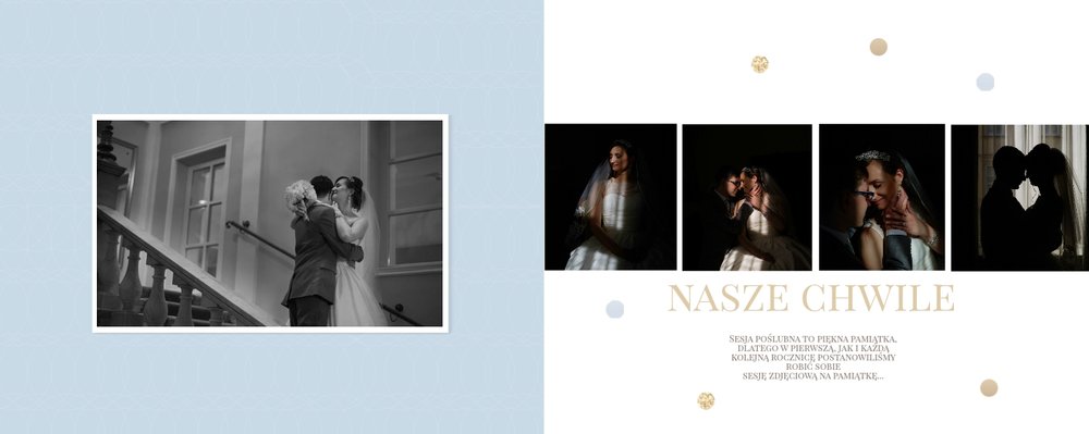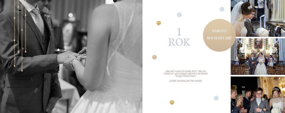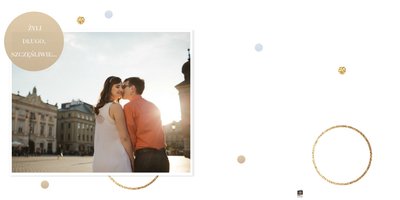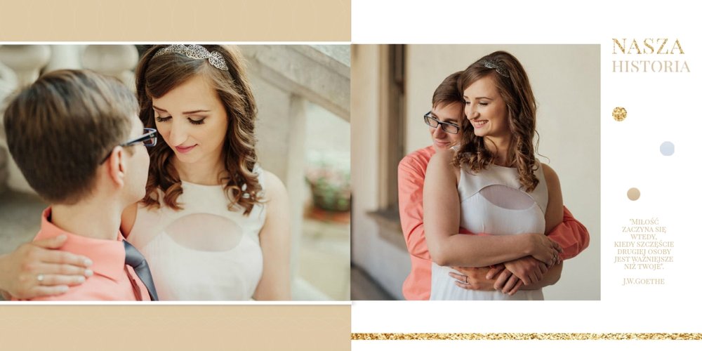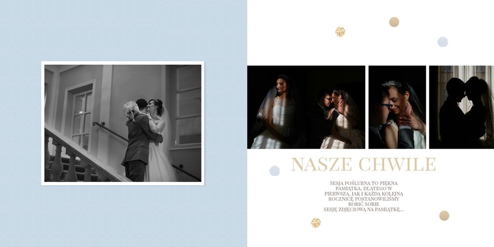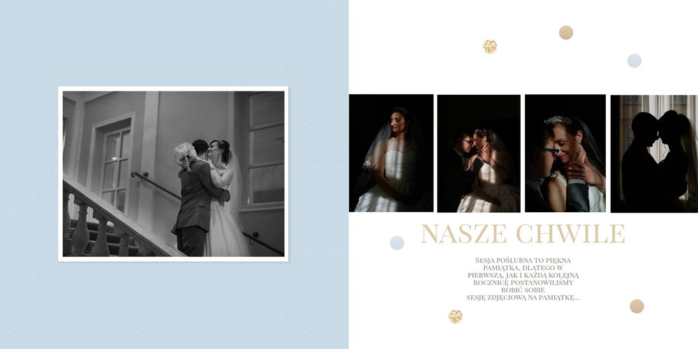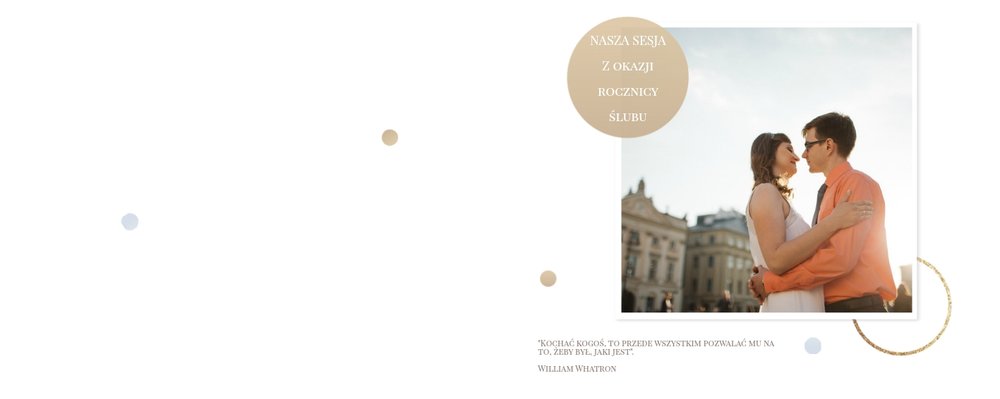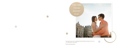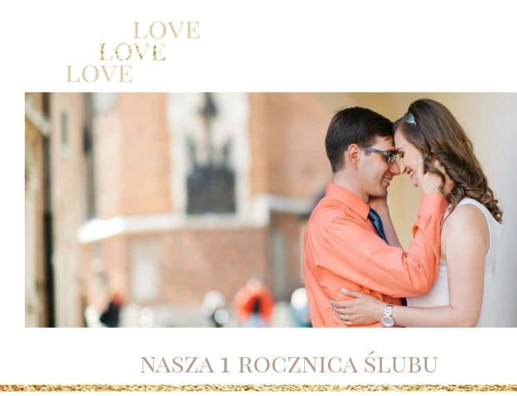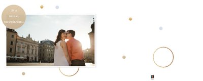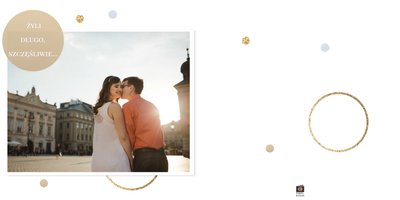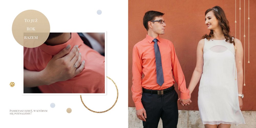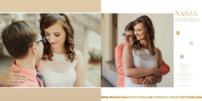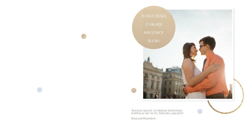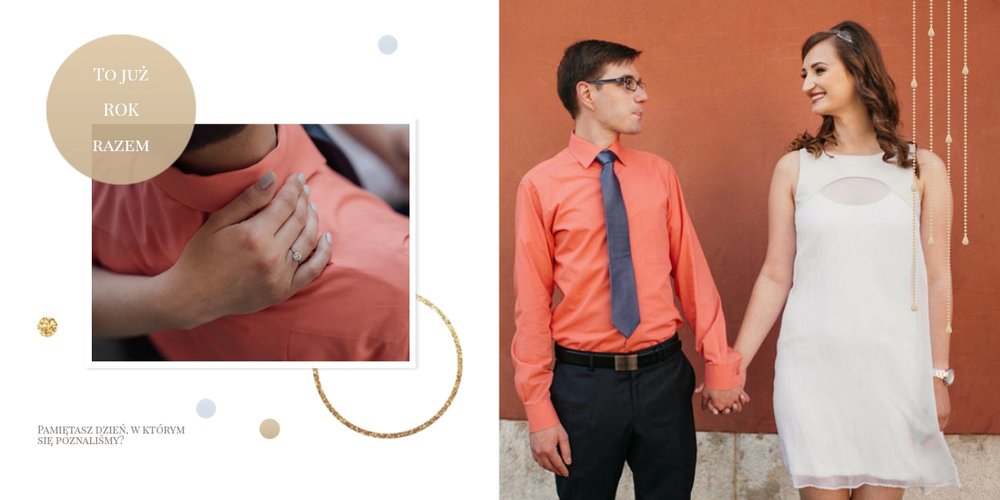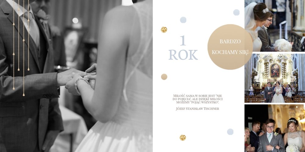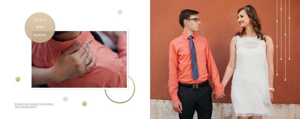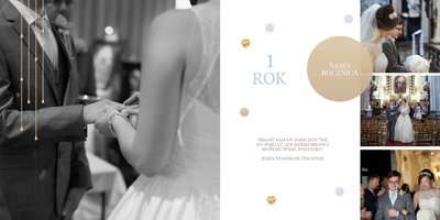 Szablon dedykowany jest Parom obchodzącym rocznicę ślubu. Jest w nim miejsce zarówno na zdjęcia aktualne, jak i przypomnienie dnia ślubu. W szablonie postawiliśmy na klasykę – biel, złoto, beż i odcienie szarości. Delikatny projekt z elegancką ornamentyką pięknie skomponuje się z Waszymi kadrami. Szablon idealny na pamiątkę z rocznicy ślubu.