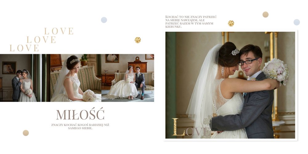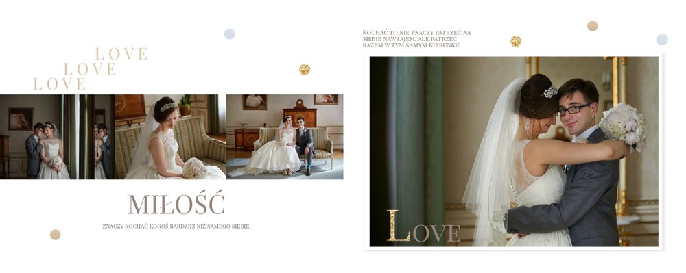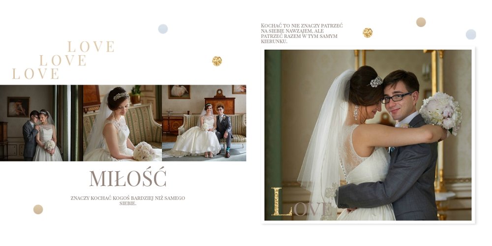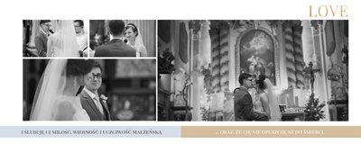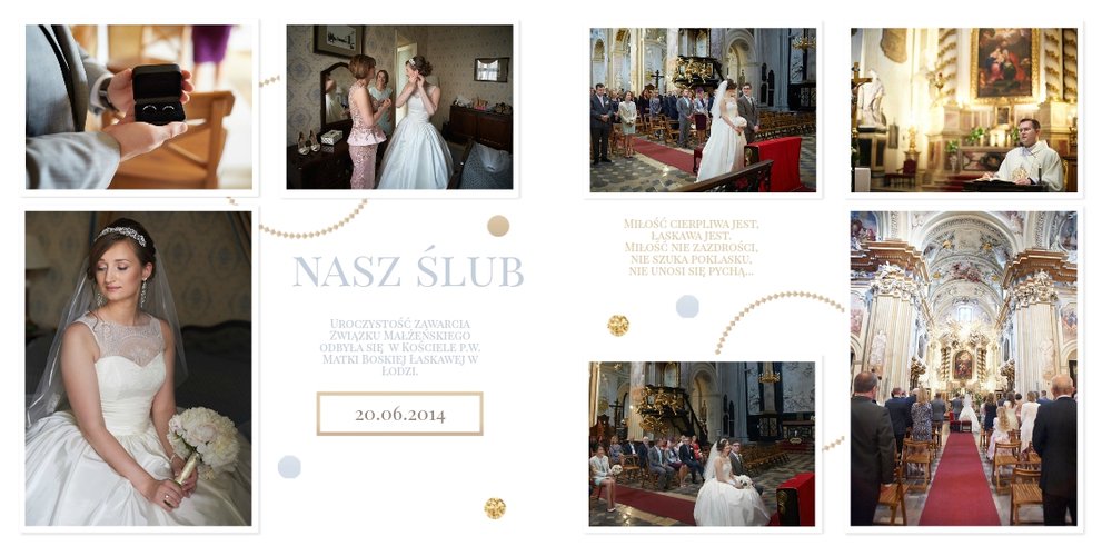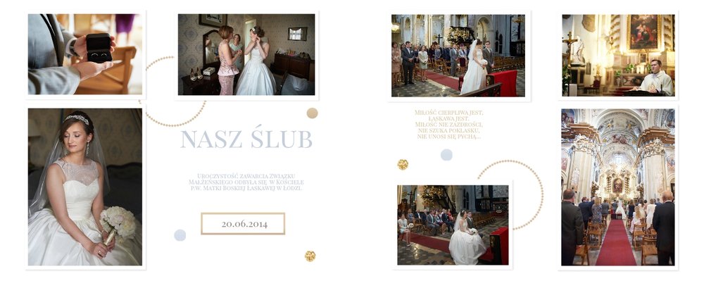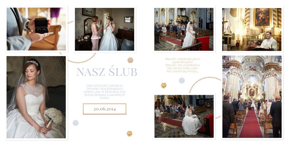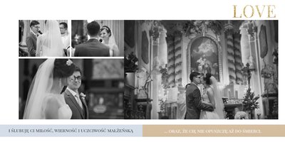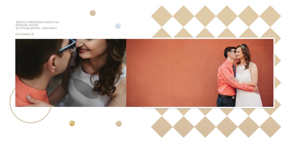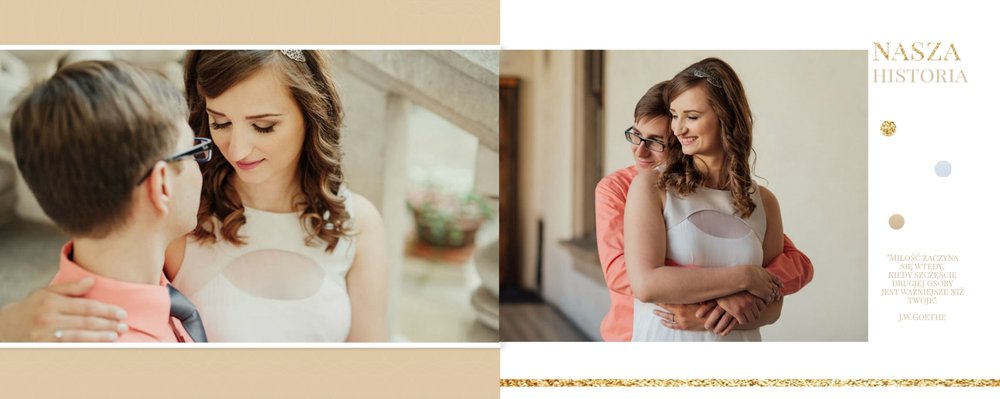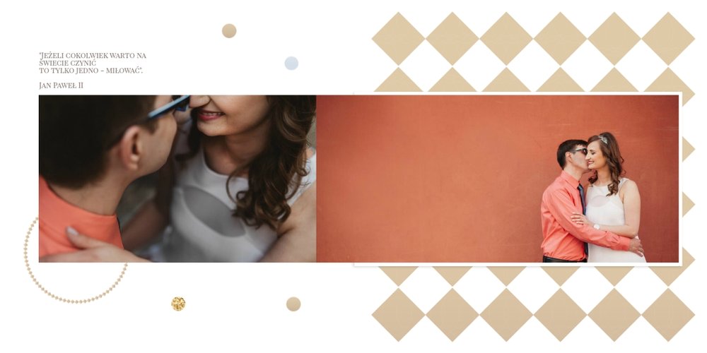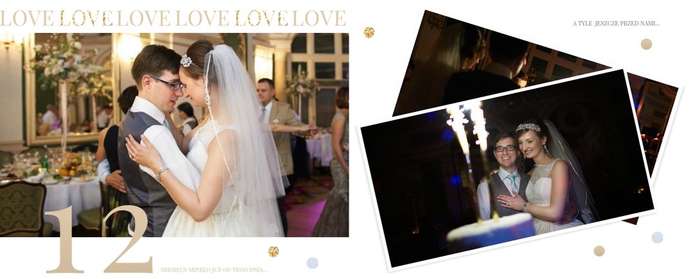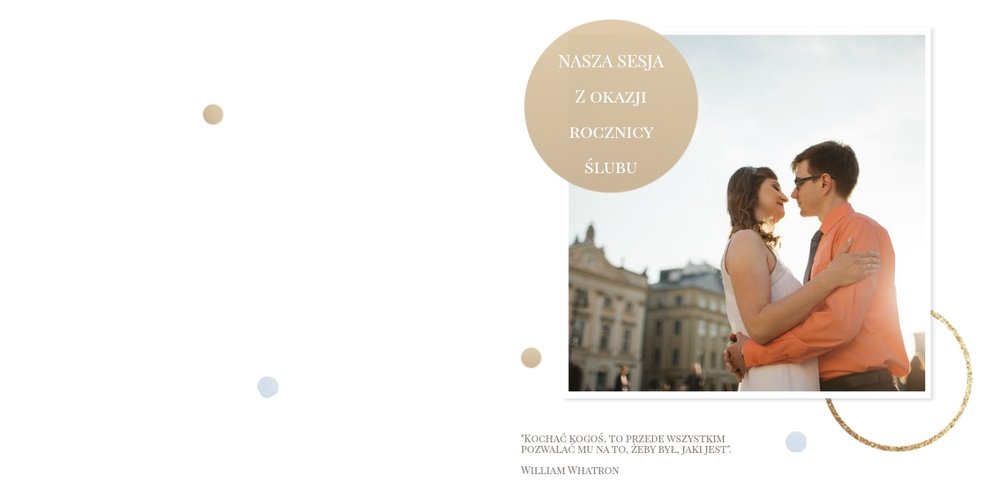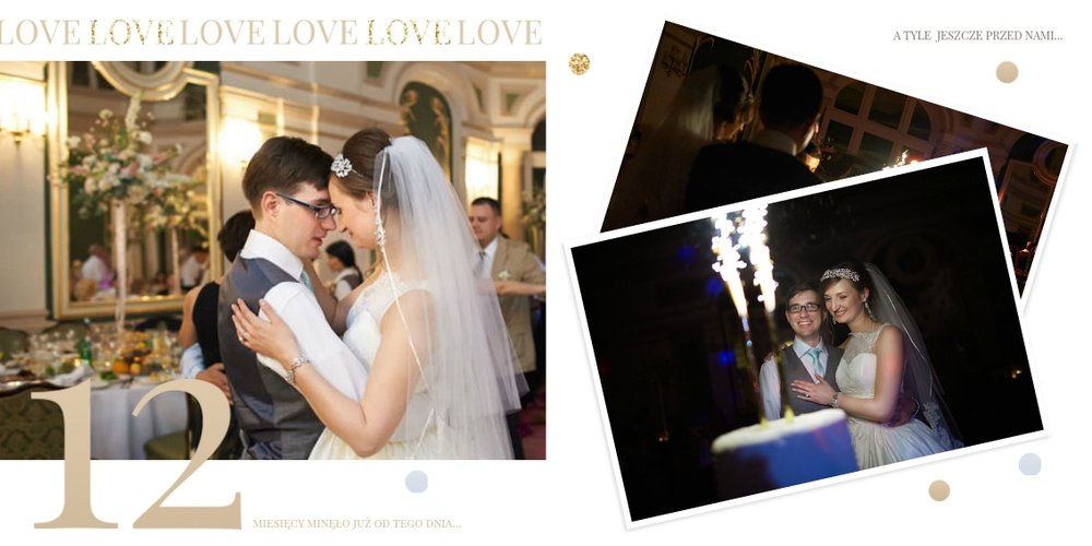 Szablon dedykowany jest Parom obchodzącym rocznicę ślubu. Jest w nim miejsce zarówno na zdjęcia aktualne, jak i przypomnienie dnia ślubu. W szablonie postawiliśmy na klasykę – biel, złoto, beż i odcienie szarości. Delikatny projekt z elegancką ornamentyką pięknie skomponuje się z Waszymi kadrami. Szablon idealny na pamiątkę z rocznicy ślubu.