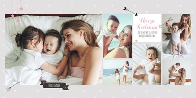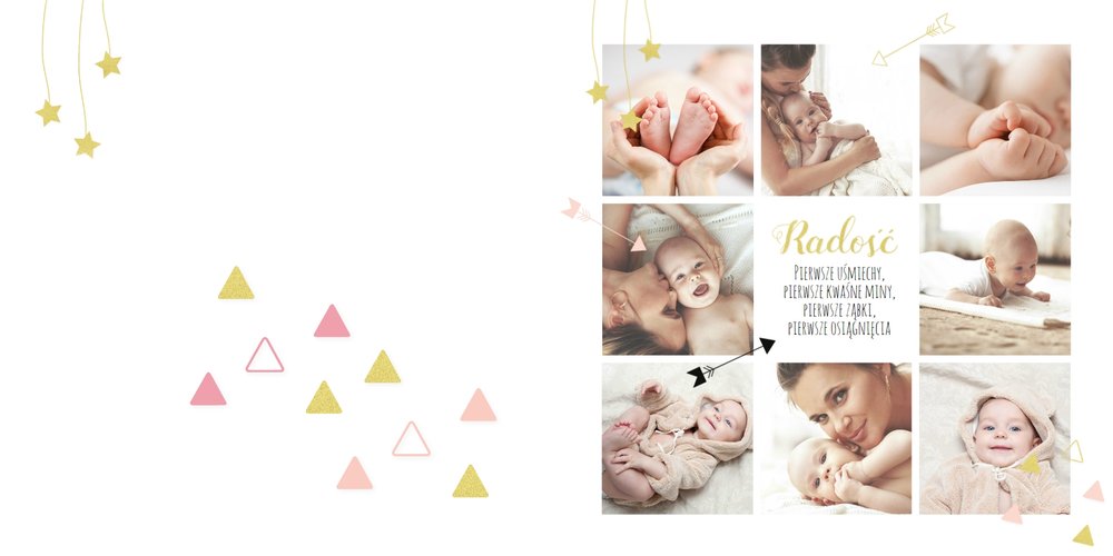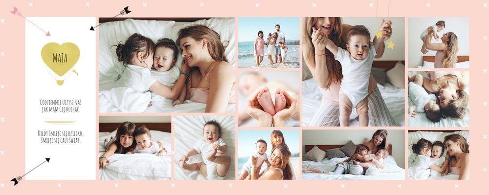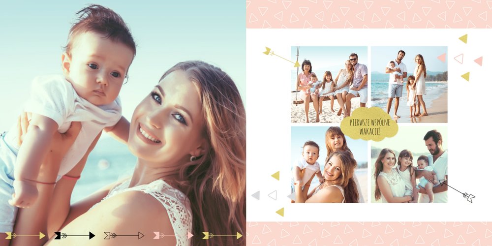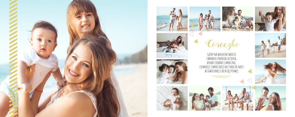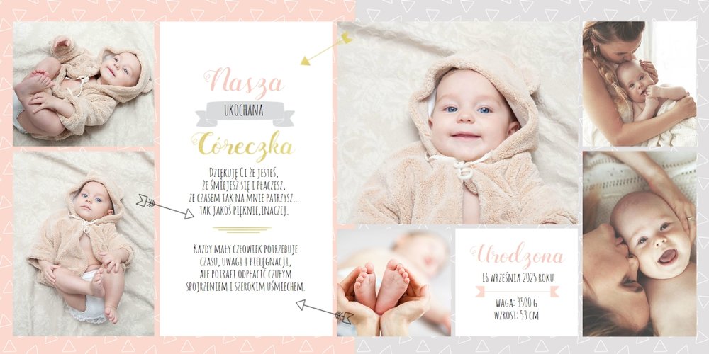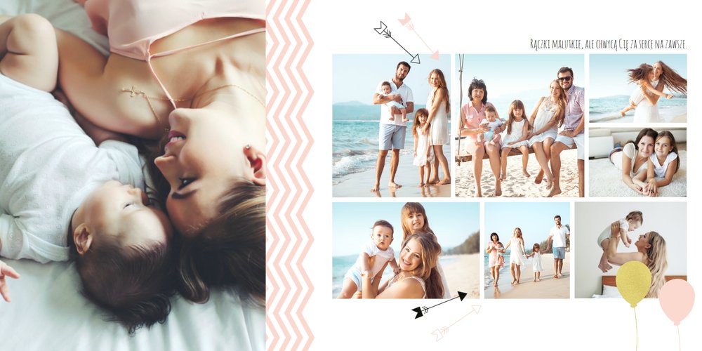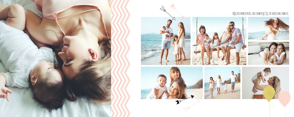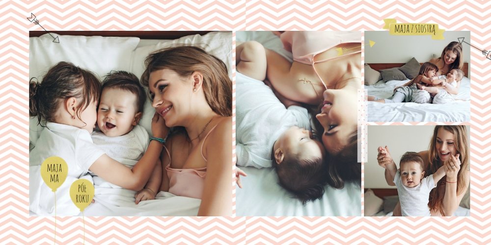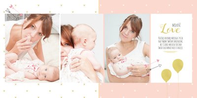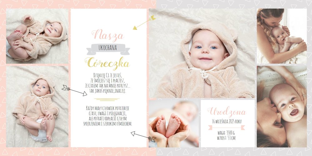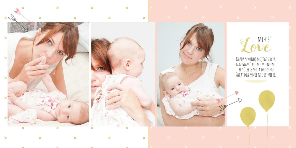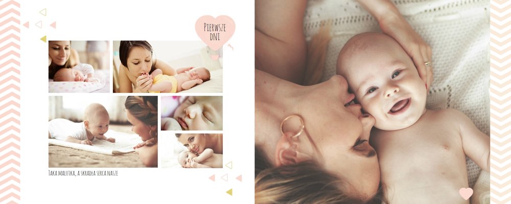 Pierwszy rok córki, to szablon dedykowany młodym rodzicom uroczych dziewczynek, którzy pragną uwiecznić pierwsze miesiące z życia córki. Delikatne kolory różu i beżu, mnóstwo miejsca na cudowne zdjęcia, oryginalne układy i dziecięca grafika sprawią, że fotoalbum z tym szablonem będzie piękną pamiątką na lata.