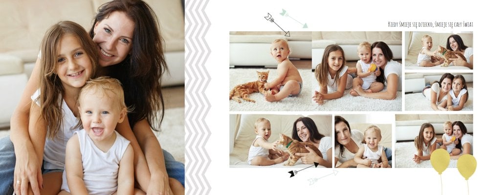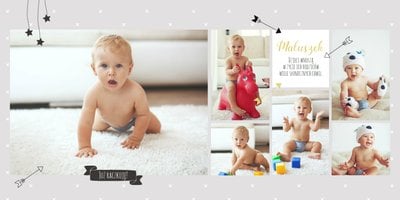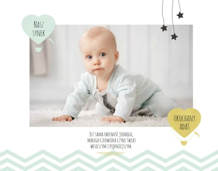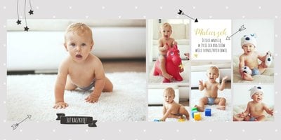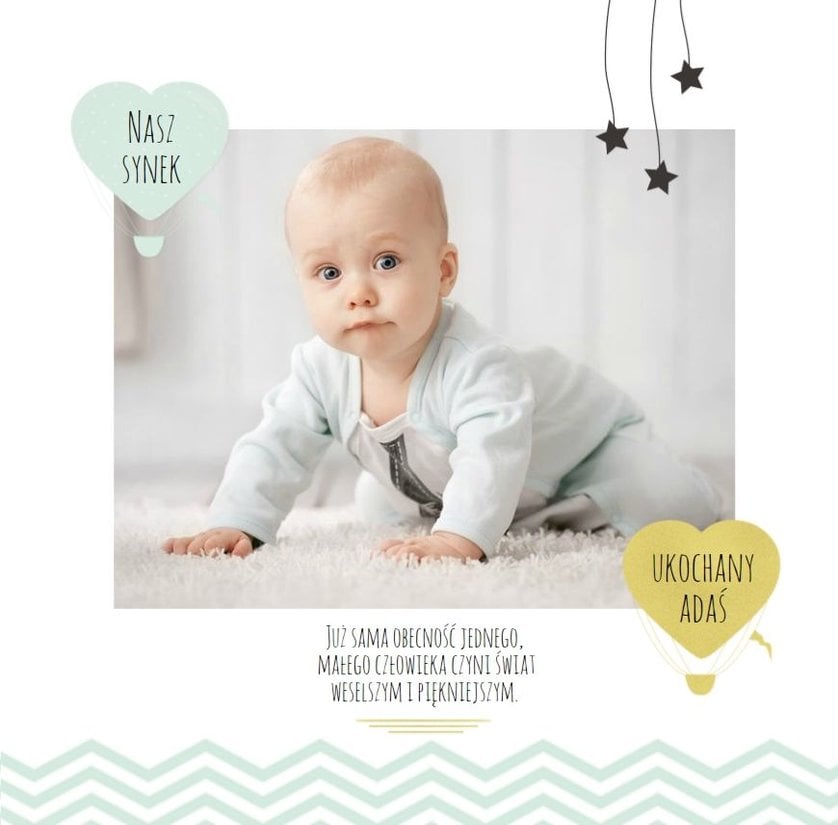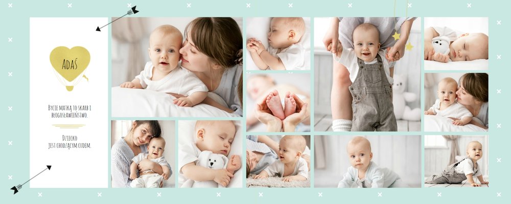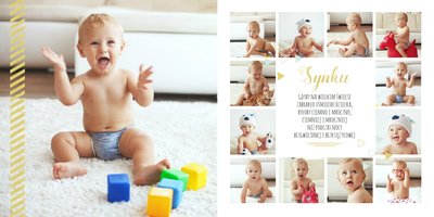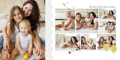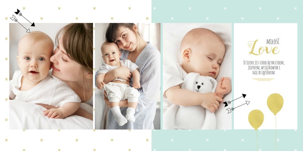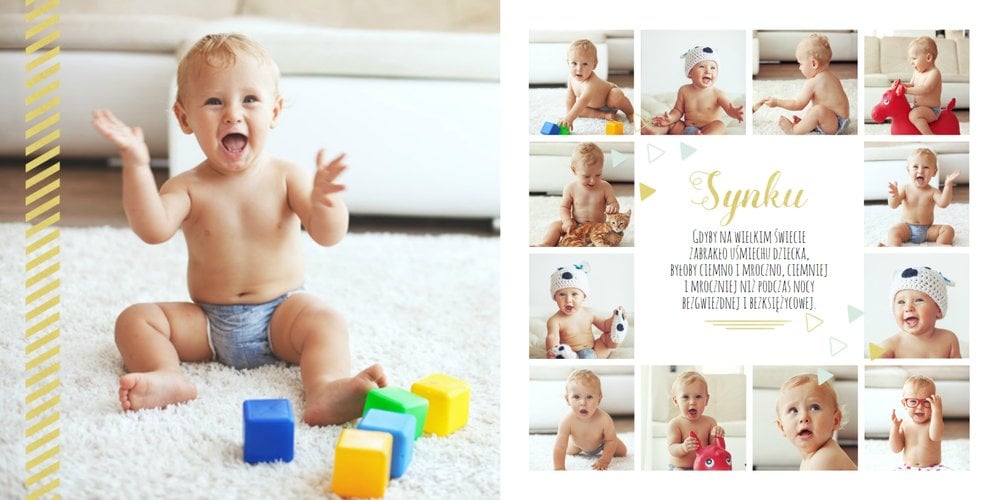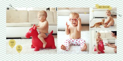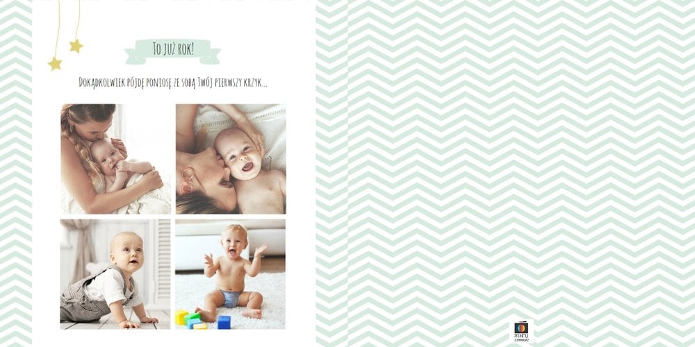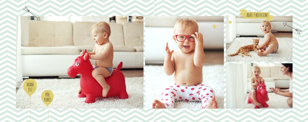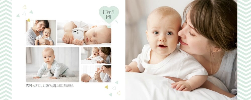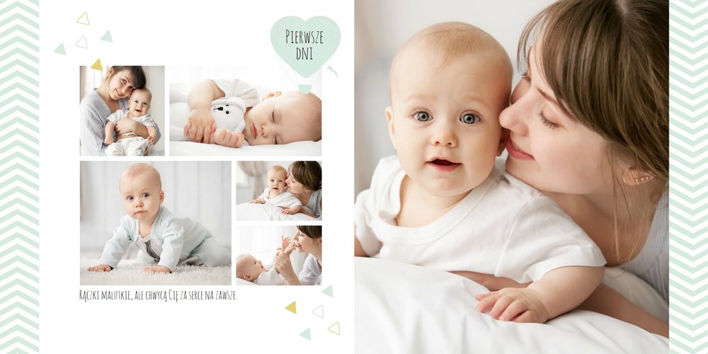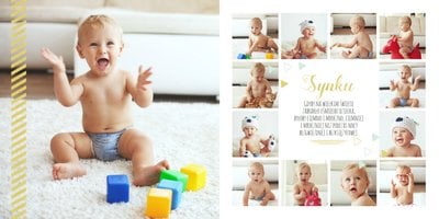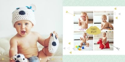 Pierwszy rok syna, to szablon dedykowany młodym rodzicom uroczych chłopców, którzy pragną uwiecznić pierwsze miesiące z życia syna. Delikatne kolory mięty i szarości, mnóstwo miejsca na cudowne zdjęcia, oryginalne układy i dziecięca grafika sprawią, że fotoalbum z tym szablonem będzie piękną pamiątką na lata.