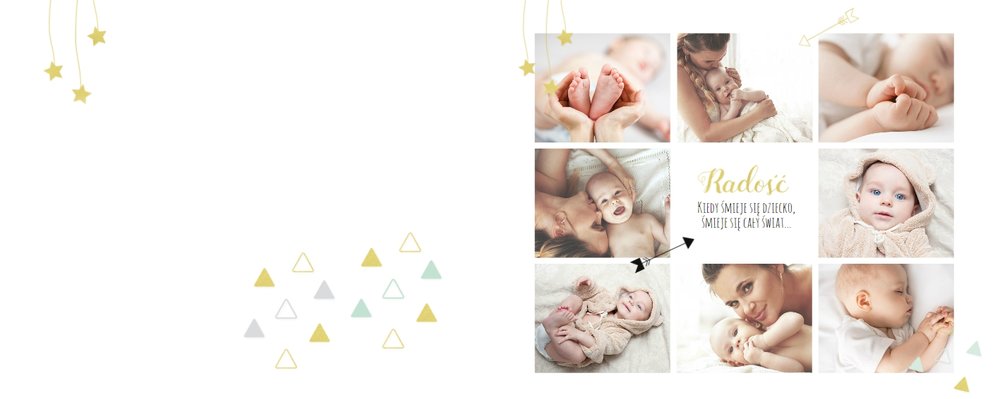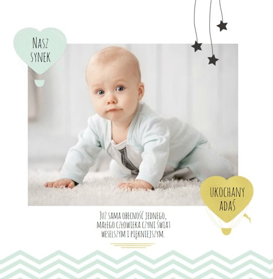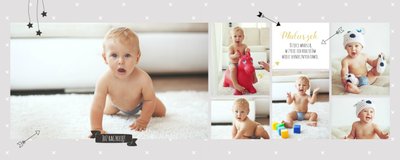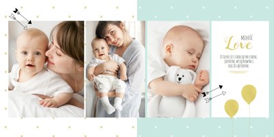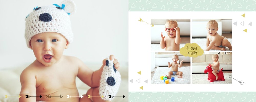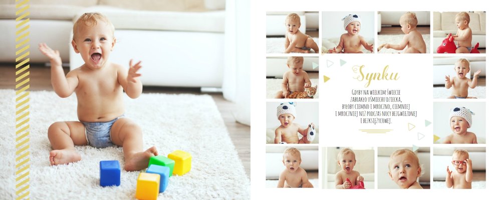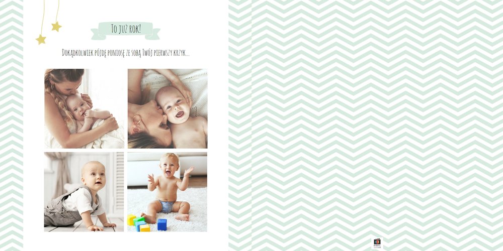 Pierwszy rok syna, to szablon dedykowany młodym rodzicom uroczych chłopców, którzy pragną uwiecznić pierwsze miesiące z życia syna. Delikatne kolory mięty i szarości, mnóstwo miejsca na cudowne zdjęcia, oryginalne układy i dziecięca grafika sprawią, że fotoalbum z tym szablonem będzie piękną pamiątką na lata.