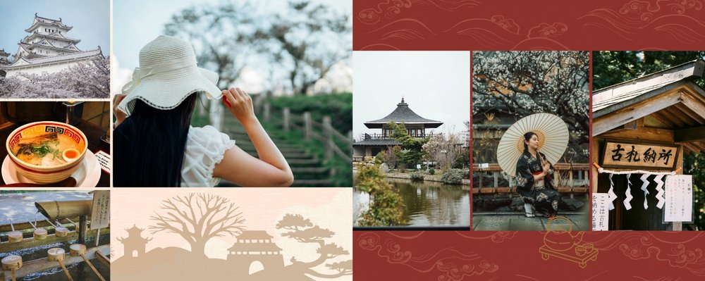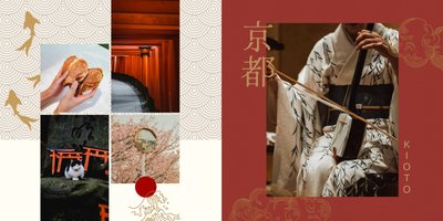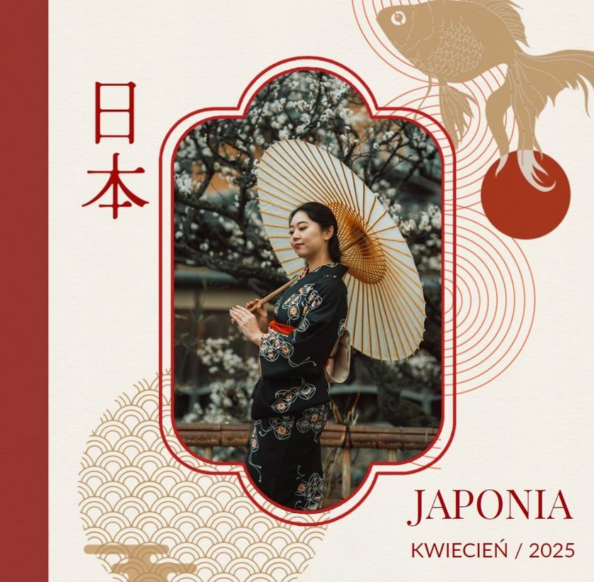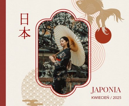 Styl szablonu to pomieszanie tradycji z nowoczesnością. Na każdej stronie projektu odnajdziesz orientalne wzory i charakterystyczne ilustracje, nawiązujące do japońskiej kultury. Maneki-neko, świątynie, rybki koi, fale - to tylko kilka z wielu motywów, które możesz znaleźć na stronach fotoksiążki. Szablon "Podróż do Japonii" wypełniony jest tłami z elementami kolażu zainspirowanymi japońską sztukę składania papieru - origami. Nazwy głównych turystycznych kierunków wyjazdu do Japonii (takich jak Tokio, Kioto, Osaka czy Nara), zapisane są zarówno w Kanji jak i po polsku. Możesz więc śmiało dostosować je pod swój plan podróży.