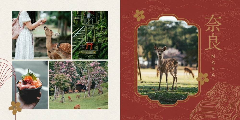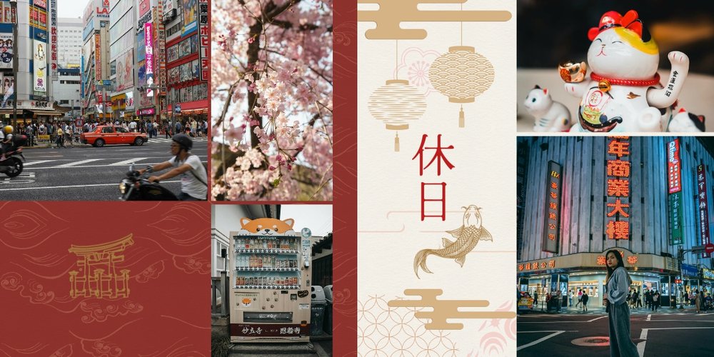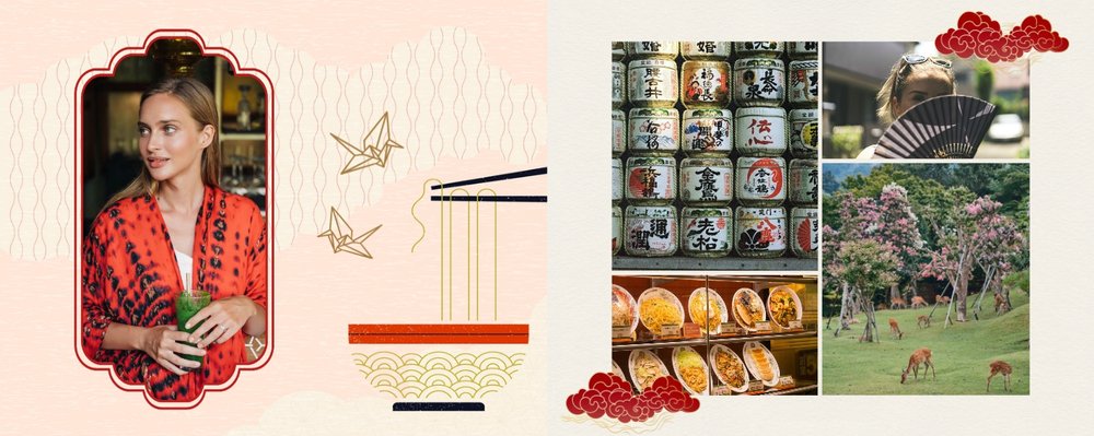Styl szablonu to pomieszanie tradycji z nowoczesnością. Na każdej stronie projektu odnajdziesz orientalne wzory i charakterystyczne ilustracje, nawiązujące do japońskiej kultury. Maneki-neko, świątynie, rybki koi, fale - to tylko kilka z wielu motywów, które możesz znaleźć na stronach fotoksiążki. Szablon "Podróż do Japonii" wypełniony jest tłami z elementami kolażu zainspirowanymi japońską sztukę składania papieru - origami. Nazwy głównych turystycznych kierunków wyjazdu do Japonii (takich jak Tokio, Kioto, Osaka czy Nara), zapisane są zarówno w Kanji jak i po polsku. Możesz więc śmiało dostosować je pod swój plan podróży.