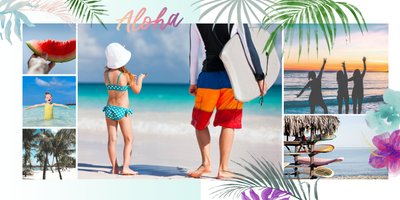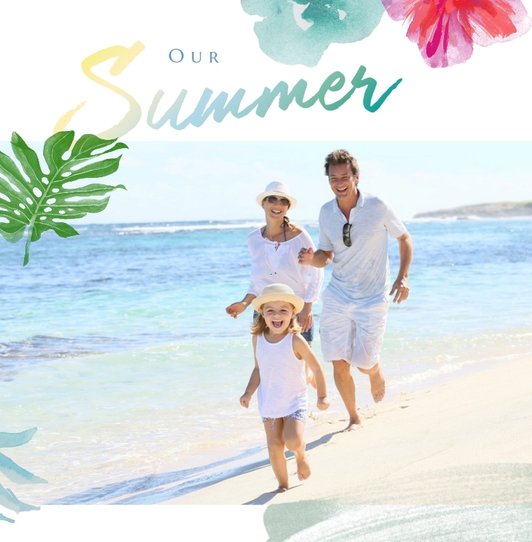 Minimalistyczna forma szablonu pozwala na zachowanie zdjęć z każdej strony świata - ważne aby fotografie pokazywały jak świetnie bawiłeś się na wakacjach życia. Całość dopełniają napisy oraz graficzne elementy symbolizujące lato w pełni.