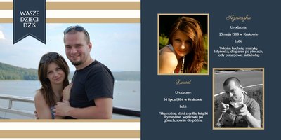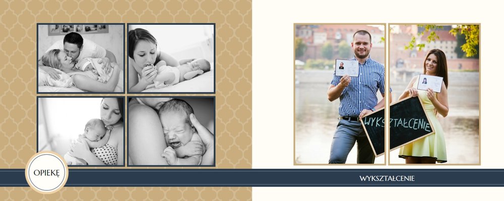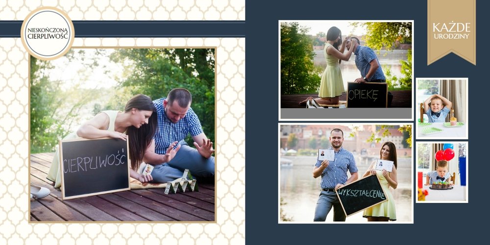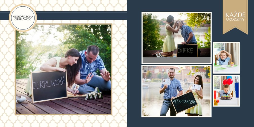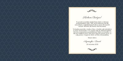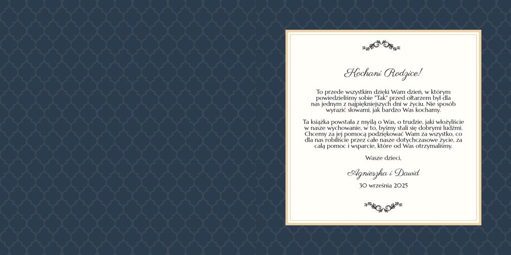 Szablon dedykowany jest Młodym Parom, które w oryginalny sposób pragną podziękować Rodzicom za miłość i trud wychowania. Strony utrzymane są w kolorach złota, beżu i granatu, którym elegancji dodają piękne ornamenty i ozdobne ramki. Szablon idealny jako podziękowanie dla Rodziców.