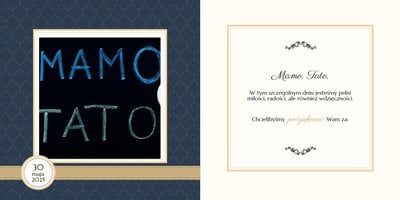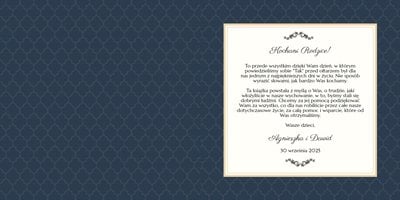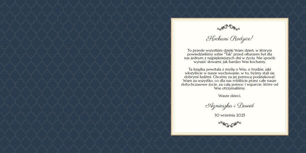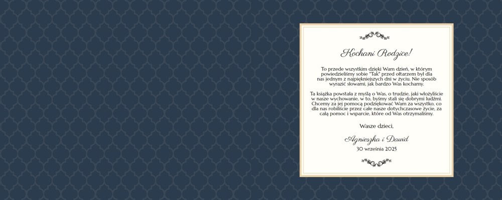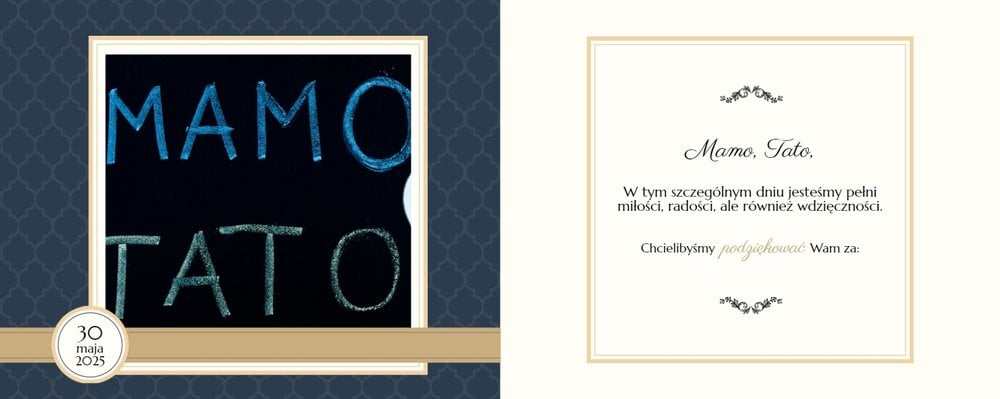 Szablon dedykowany jest Młodym Parom, które w oryginalny sposób pragną podziękować Rodzicom za miłość i trud wychowania. Strony utrzymane są w kolorach złota, beżu i granatu, którym elegancji dodają piękne ornamenty i ozdobne ramki. Szablon idealny jako podziękowanie dla Rodziców.