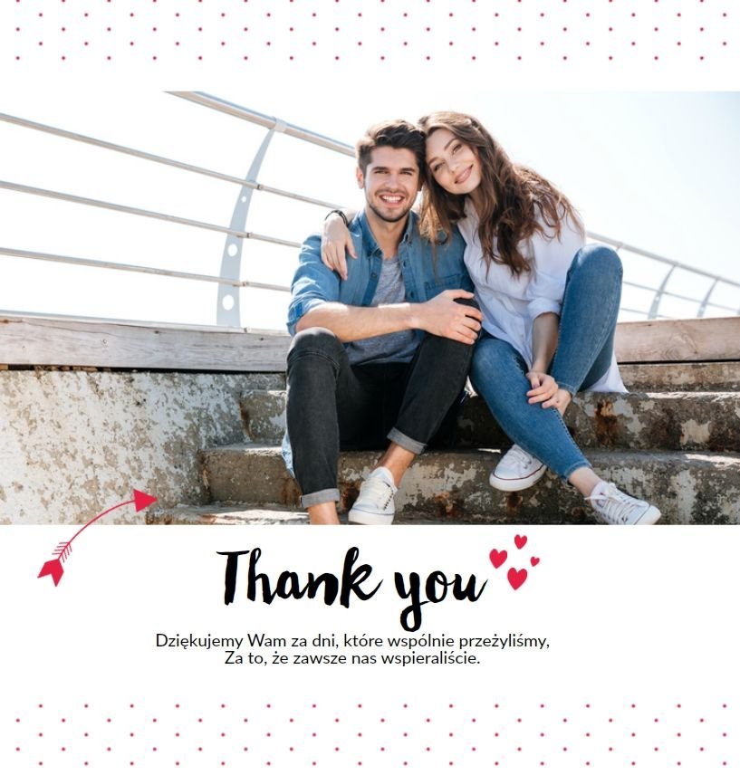 Z szablonem Podziękowania ślubne zaprojektujesz ekskluzywny fotoalbum dla Waszych rodziców. Wasze najpiękniejsze zdjecia z pięknymi życzeniami, staną się oryginalnym prezentem dla najważniejszych osób w Waszym życiu. Minimalistyczna forma, oryginalne układy zdjęć i piękne, czerwone dodatki, pozwolą cieszyć się wyjątkowymi wspomnieniami przez wiele, wiele lat. Spraw przyjemność Tobie i Twoim bliskim!