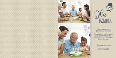 Piękne, rodzinne chwile warto celebrować, utrwalać w pamięci i zatrzymywać na zdjęciach. Fotoalbum pełny wnuków i bliskiej rodziny będzie najpiękniejszym prezentem dla naszego dziadka. Szablon "Dla kochanego Dziadka" dedykujemy wszystkim wnukom, które chcą podarować mu coś wyjątkowego. Tła beżowe i granatowe idealnie skomponują się z rodzinnymi fotografiami lub skanami zdjęć. Fotoalbum zaprojektowany z tym szablonem będzie to idealny prezent na Dzień Dziadka oraz wiele ważnych okazji.