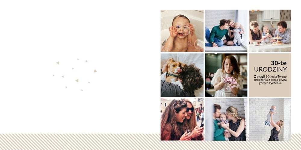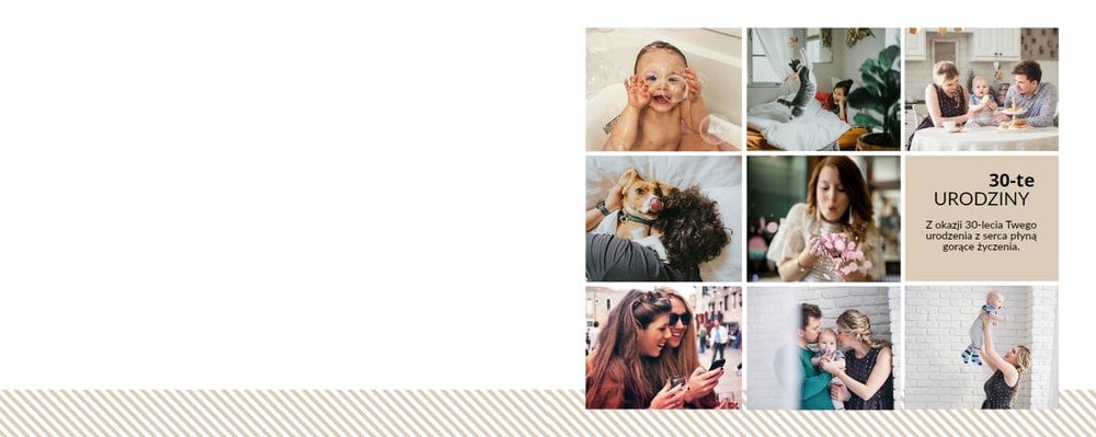 Prezent na 30 urodziny to szablon, z którym zaprojektujesz wyjątkowy fotoalbum z najpiękniejszymi wspomnieniami zachowanymi na fotografiach. Zbierz najważniejsze zdjęcia bliskiej Ci osoby i skomponuj oryginalny album! Nietuzinkowa grafika, mnóstwo miejsca na fotografie oraz wzruszające życzenia sprawią, że fotoalbum z szablonem Prezent na 30 urodziny stanie się cudowną pamiątką na wiele, wiele lat!