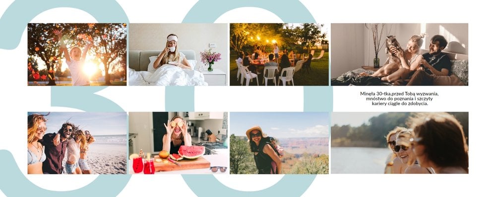 Prezent na 30 urodziny to szablon, z którym zaprojektujesz wyjątkowy fotoalbum z najpiękniejszymi wspomnieniami zachowanymi na fotografiach. Zbierz najważniejsze zdjęcia bliskiej Ci osoby i skomponuj oryginalny album! Nietuzinkowa grafika, mnóstwo miejsca na fotografie oraz wzruszające życzenia sprawią, że fotoalbum z szablonem Prezent na 30 urodziny stanie się cudowną pamiątką na wiele, wiele lat!