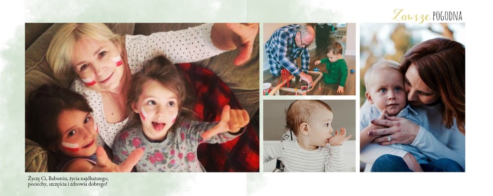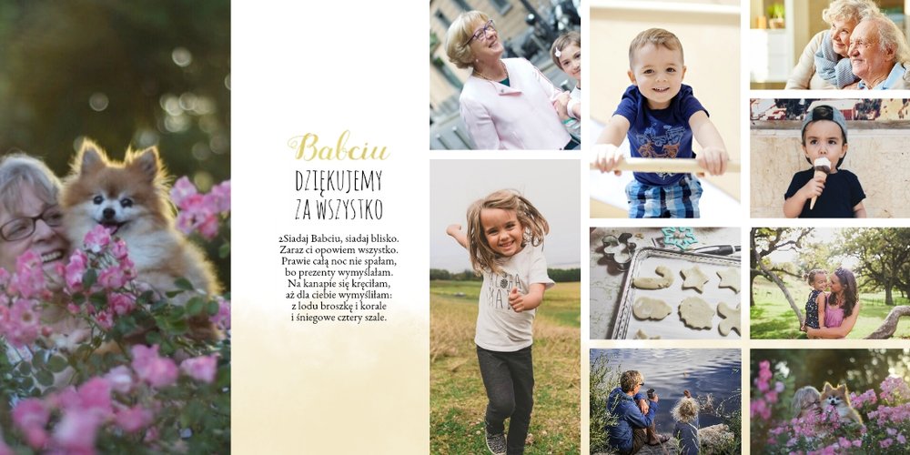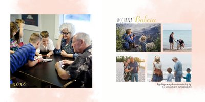 Dzień Babci, to szablon dzięki któremu każdy wnuk zaprojektuje wyjątkowy fotoalbum dla swojej ukochanej Babci. Pastelowe kolory, prosty motyw i piękne układy sprawią, że książka z rodzinnymi zdjęciami będzie pamiątką na lata. Spraw Babci radość i stwórz dla niej oryginalny fotoalbum.
