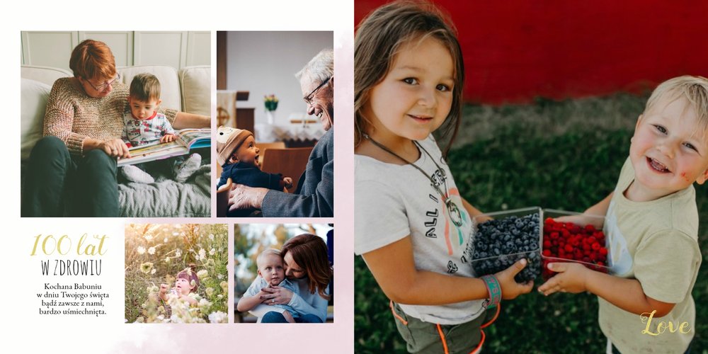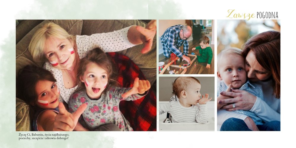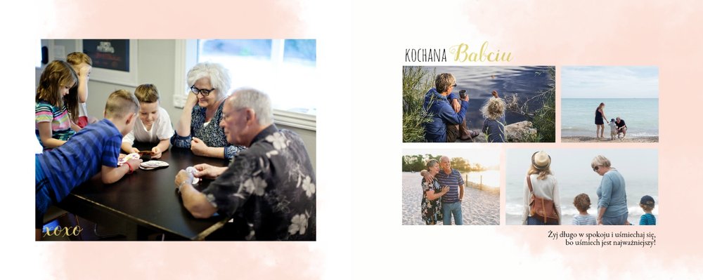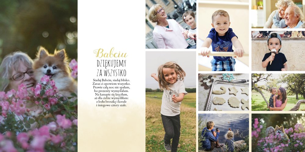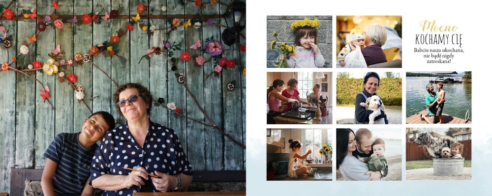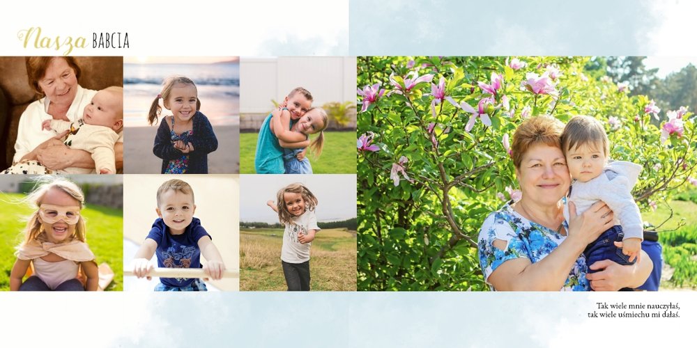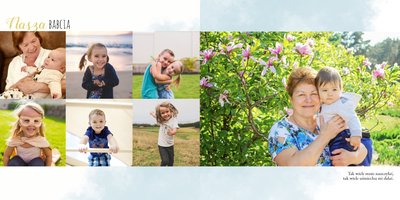 Dzień Babci, to szablon dzięki któremu każdy wnuk zaprojektuje wyjątkowy fotoalbum dla swojej ukochanej Babci. Pastelowe kolory, prosty motyw i piękne układy sprawią, że książka z rodzinnymi zdjęciami będzie pamiątką na lata. Spraw Babci radość i stwórz dla niej oryginalny fotoalbum.