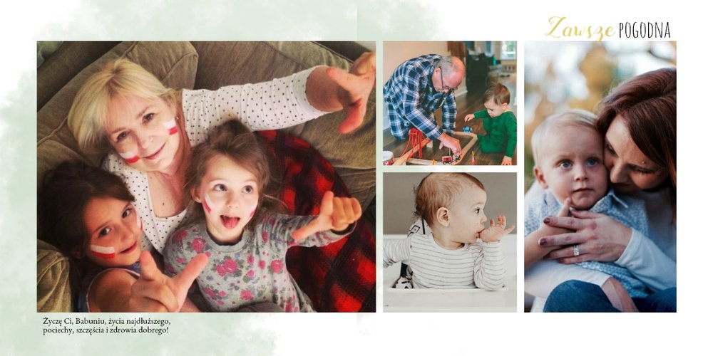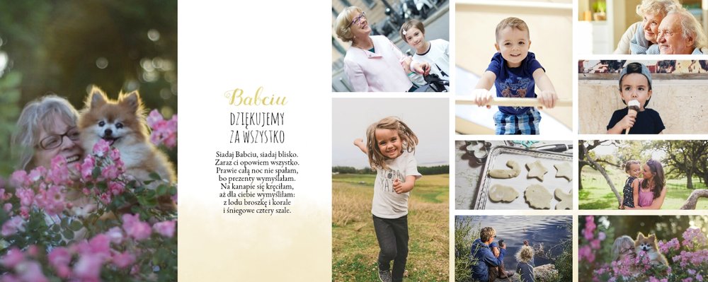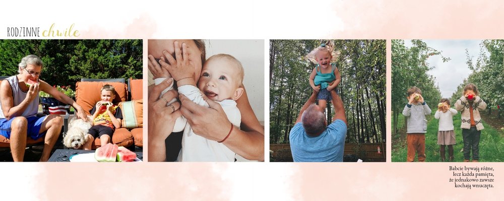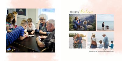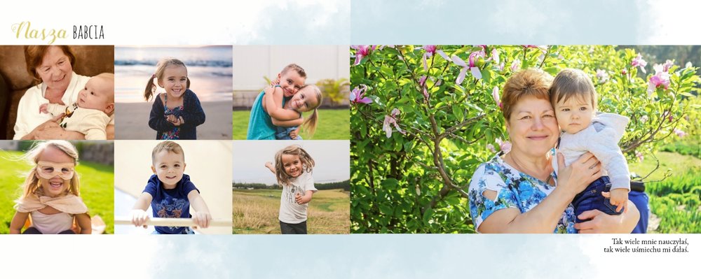 Dzień Babci, to szablon dzięki któremu każdy wnuk zaprojektuje wyjątkowy fotoalbum dla swojej ukochanej Babci. Pastelowe kolory, prosty motyw i piękne układy sprawią, że książka z rodzinnymi zdjęciami będzie pamiątką na lata. Spraw Babci radość i stwórz dla niej oryginalny fotoalbum.