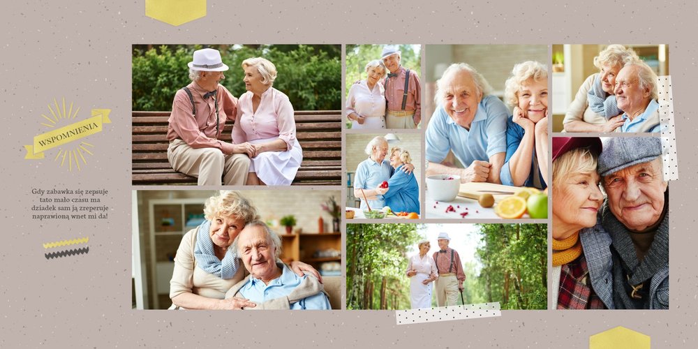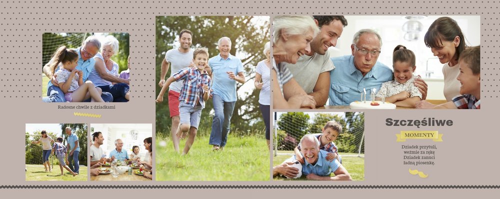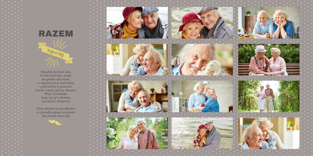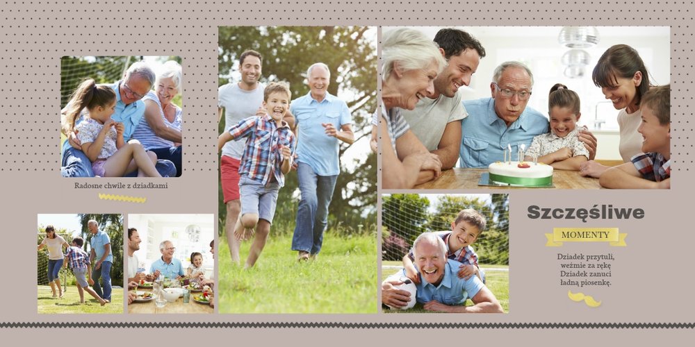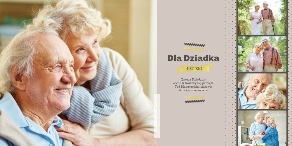 Fotoalbum z szablonem Dzień Dziadka dedykowany jest wszystkim kochającym wnukom , którzy pragną w tym wyjątkowym dniu sprawić swoim Dziadkom radość. Zdjęcia połączone z pięknym motywem szablonu oraz z oryginalnymi wierszykami, wywołają u Dziadka pozytywne emocje. Zaprojektuj rodzinną książkę i spraw Dziadkowi prezent na lata.