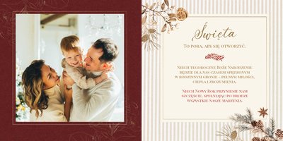 Fotoalbum z szablonem "Prezent na Święta" to idealna propozycja jako prezent pod choinkę dla miłośników stylu boho. W środku znajdują się przepiękne, świąteczne ilustracje, nawiązujące swoim stylem do baśniowych ilustracji z książek. Alternatywą w tym szablonie świątecznym są kolory - beż, karmel, piernik oraz świąteczna czerwień. Wszystkie idealnie podkreślą każde rodzinne zdjęcia, a złote ramki wokół dodadzą im jeszcze bardziej odświętny wygląd.