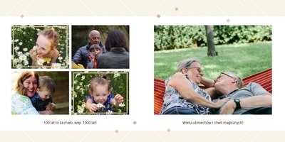 Szablon Dla najlepszych Dziadków został przygotowany przede wszystkim jako propozycja prezentu na Dzień Babci i Dziadka, jest jednak na tyle uniwersalny, że możesz również sprezentować fotoksiążkę z nim z okazji np. urodzin Babci, imienin Dziadka czy innej uroczystości. Znajdziesz w nim minimalistyczne geometryczne tła i złote motywy, które ozdobią Twoje fotografie, ale ich nie przytłoczą. Z tej serii: Ona i On (szablon ślubny), Dla naszych Rodziców (podziękowania dla rodziców), Dla Ciebie (na prezent).