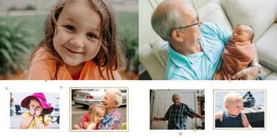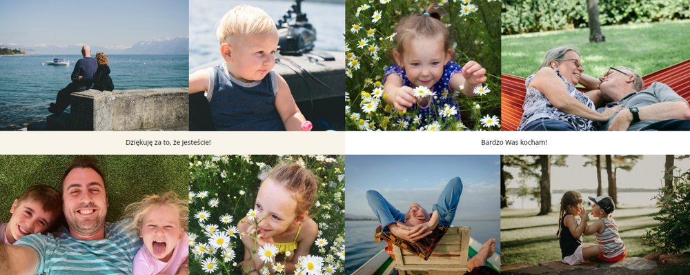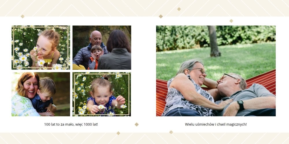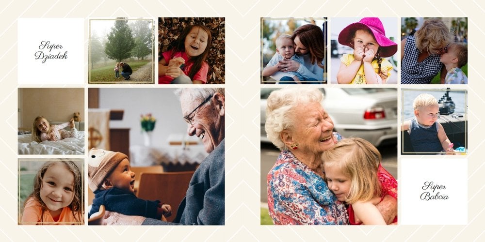Szablon Dla najlepszych Dziadków został przygotowany przede wszystkim jako propozycja prezentu na Dzień Babci i Dziadka, jest jednak na tyle uniwersalny, że możesz również sprezentować fotoksiążkę z nim z okazji np. urodzin Babci, imienin Dziadka czy innej uroczystości. Znajdziesz w nim minimalistyczne geometryczne tła i złote motywy, które ozdobią Twoje fotografie, ale ich nie przytłoczą. Z tej serii: Ona i On (szablon ślubny), Dla naszych Rodziców (podziękowania dla rodziców), Dla Ciebie (na prezent).