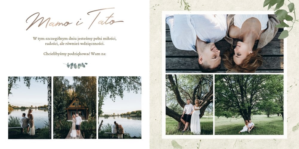 Rustykalne podziękowania dla Rodziców to kolejna część rustykalnej serii szablonów. Fotoalbum z tym szablonem to odwzorowanie natury i minimalizmu - a to wszystko zamknięte wewnątrz oryginalnego projektu. Szablon pozwoli Ci w nietypowy sposób wyrazić wdzięczność i miłość do ukochanych Rodziców. Natomiast wnętrze zapewnia mnóstwo miejsca na wspomnienia z dziecięcych lat, a także na aktualne zdjęcia - na przykład z Waszej narzeczeńskiej sesji. Fotoalbum z szablonem Rustykalne podziękowania dla Rodziców zawiera białe strony, które upiększone są złotymi napisami graficznymi i roślinnymi grafikami. Tak przygotowana fotoalbum to idealna propozycja na prezent dla Rodziców w tak szczególnym dniu.