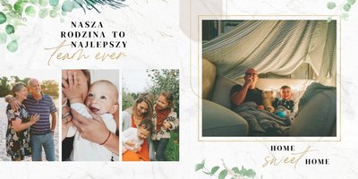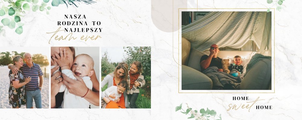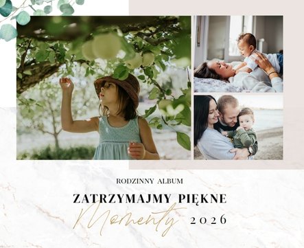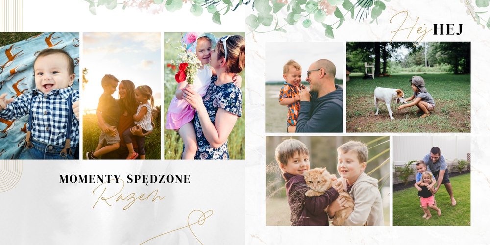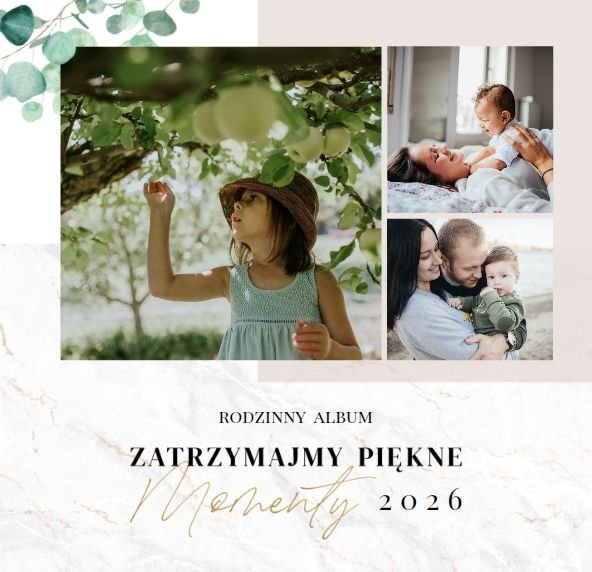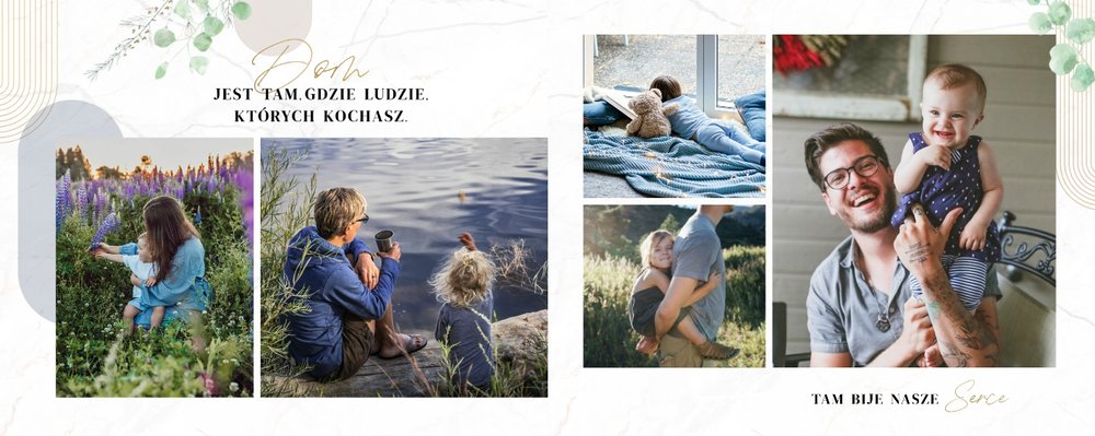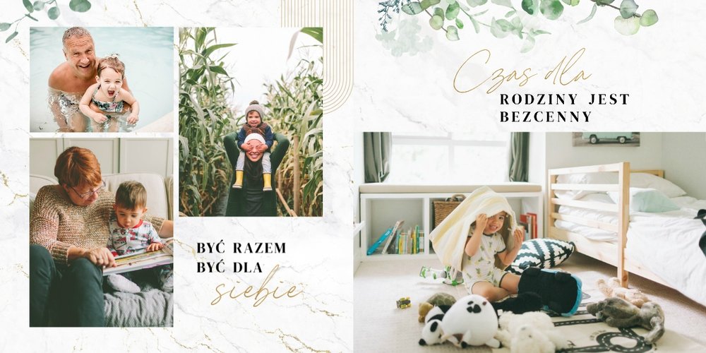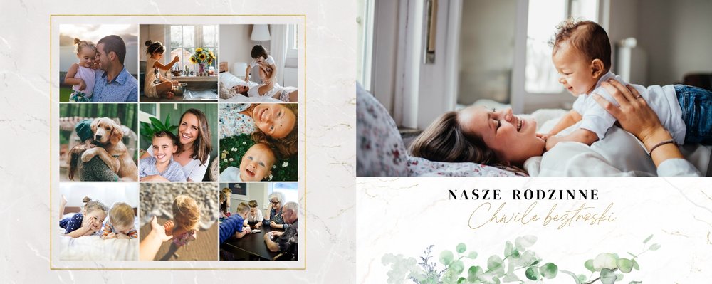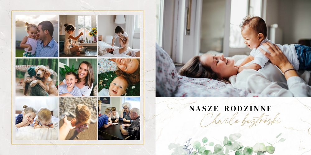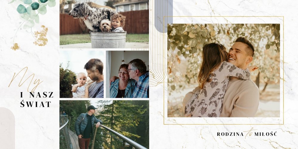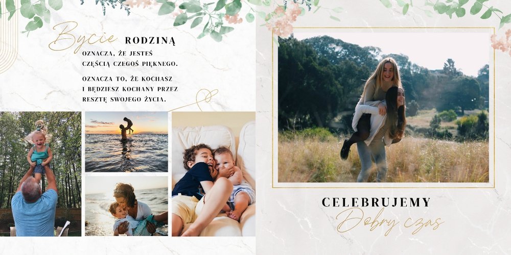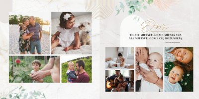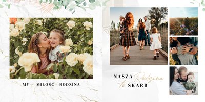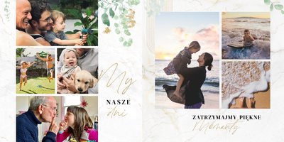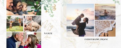 Szablon "Skarby naszej rodziny" nawiązuje do motywu rustykalnego, jednak fotoalbum uzupełniony jest także o marmurowe strony, ozdobione pozłacanymi elementami graficznymi. Całość dopełniają dwie czcionki: delikatna pisana czcionka oraz nieco mocniejsza czarna, dzięki którym wyrazisz głęboko skrywane uczucia.