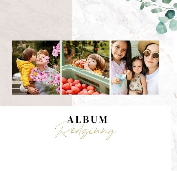 Szablon "Skarby naszej rodziny" nawiązuje do motywu rustykalnego, jednak fotoalbum uzupełniony jest także o marmurowe strony, ozdobione pozłacanymi elementami graficznymi. Całość dopełniają dwie czcionki: delikatna pisana czcionka oraz nieco mocniejsza czarna, dzięki którym wyrazisz głęboko skrywane uczucia.