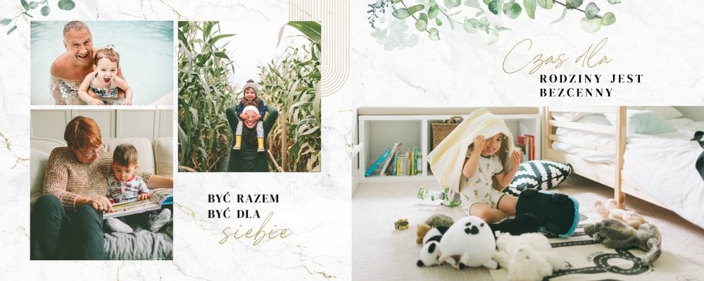 Szablon "Skarby naszej rodziny" nawiązuje do motywu rustykalnego, jednak fotoalbum uzupełniony jest także o marmurowe strony, ozdobione pozłacanymi elementami graficznymi. Całość dopełniają dwie czcionki: delikatna pisana czcionka oraz nieco mocniejsza czarna, dzięki którym wyrazisz głęboko skrywane uczucia.