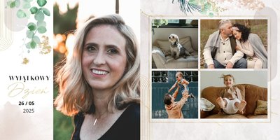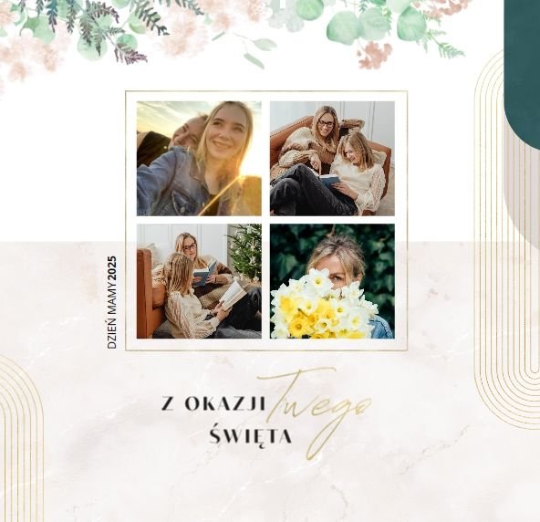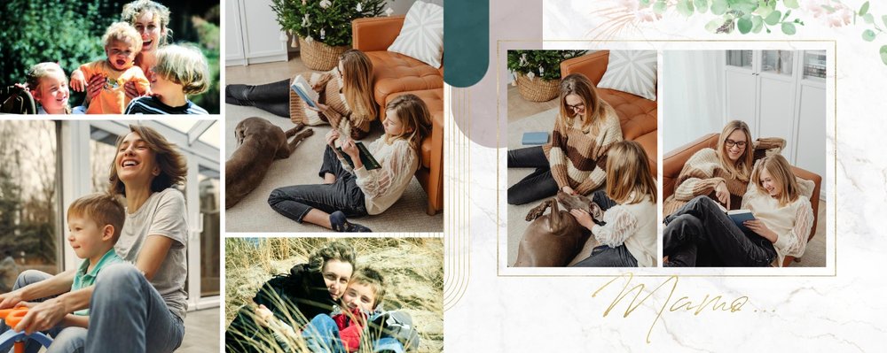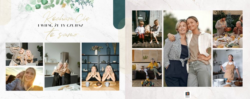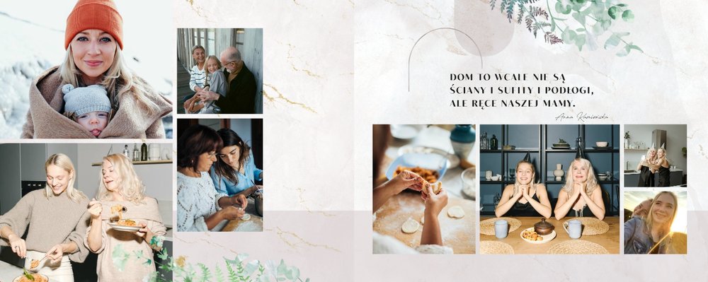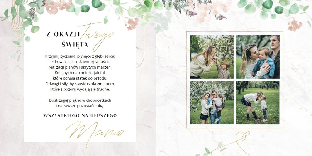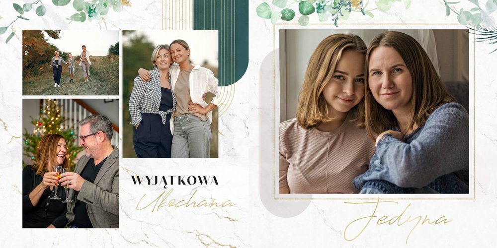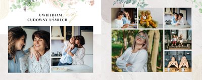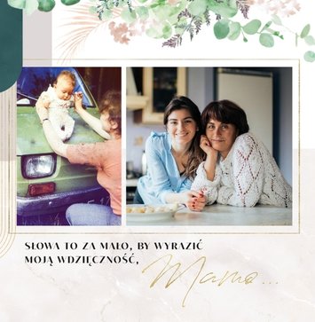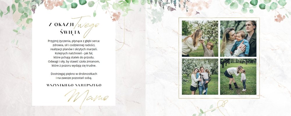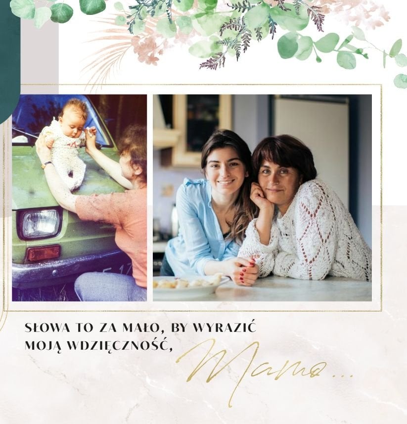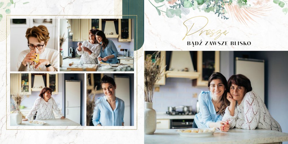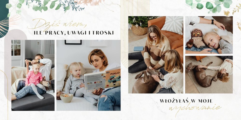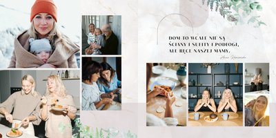 Fotoalbum z szablonem "Słowa to za mało" to wyjątkowa forma okazania uczuć ukochanej Mamie. W szablonie zostały ujęte życzenia, sentencje i krótkie zdania, wyrażające miłość i podziękę. Po uzupełnieniu komórek zdjęciowych, tekstom towarzyszyć będą Wasze wspólne fotografie od najmłodszych lat, które z pewnością wywołają u Mamy wzruszenie. Całość zdobią delikatne marmurowe tła, złote ornamenty, kwiaty oraz liście eukaliptusa.