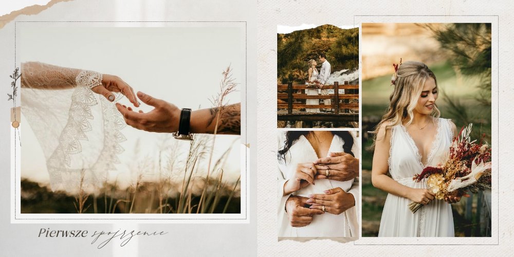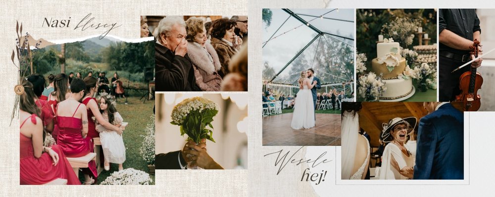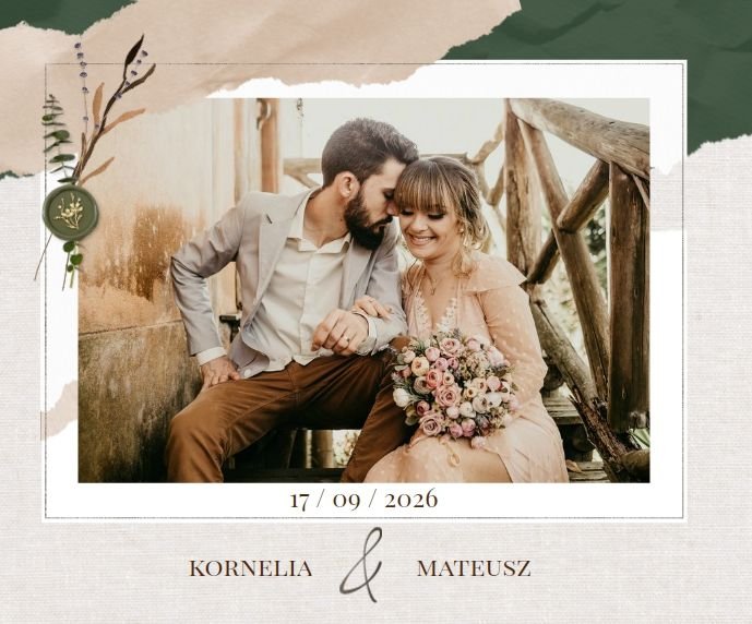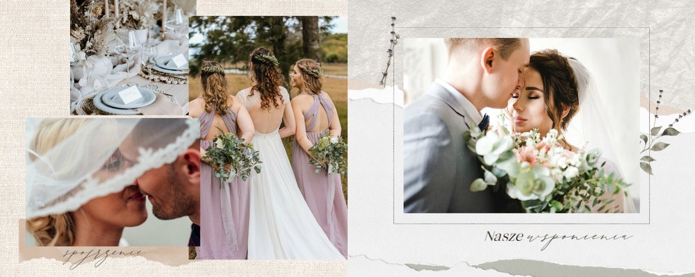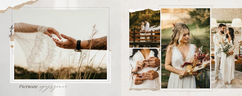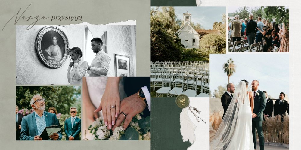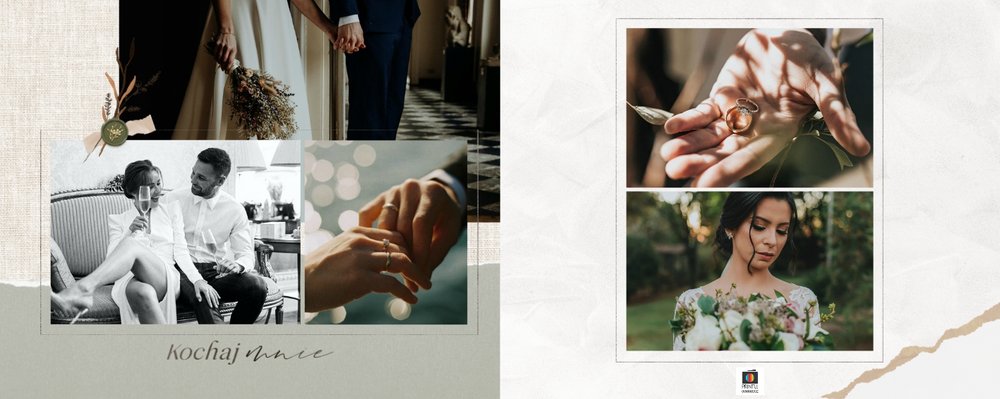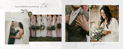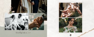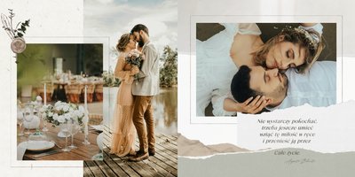 Fotoalbum "Ślub w plenerze" to propozycja dla osób ceniących delikatność, naturę i minimalizm. Kolory szablonu - beż, butelkowa zieleń i biel - idealnie pasują do fotografii ślubnych w stylu rustykalnym i boho. Strony przyozdobione zostały w subtelne elementy bliskie romantycznej naturze, takie jak skrawki papeterii, polne kwiatki oraz woskowe pieczęcie. Cienkie ramki okalające zdjęcia podkreślą ich elegancję. Czułe, krótkie teksty, nawiązujące do ważnych momentów każdego ślubu, na zawsze zapiszą najpiękniejsze wspomnienia z tego najważniejszego dnia.
