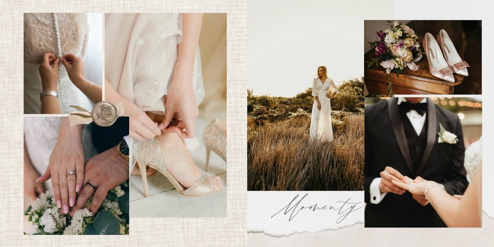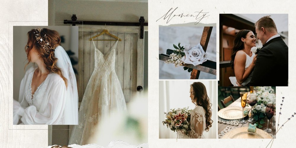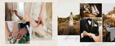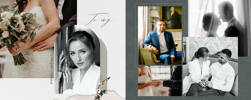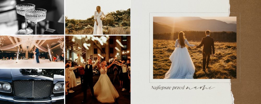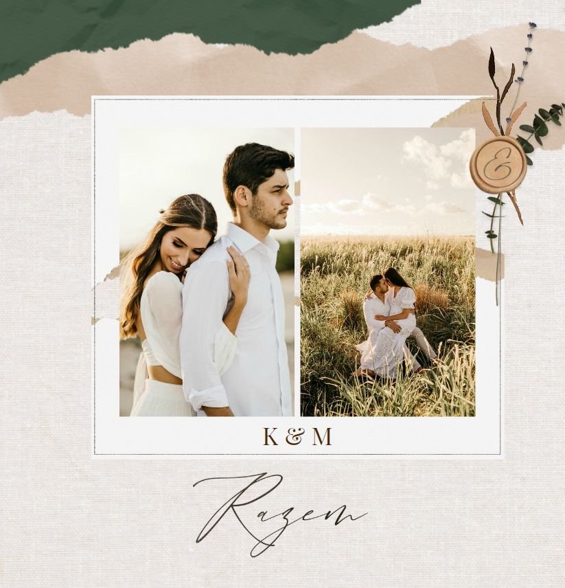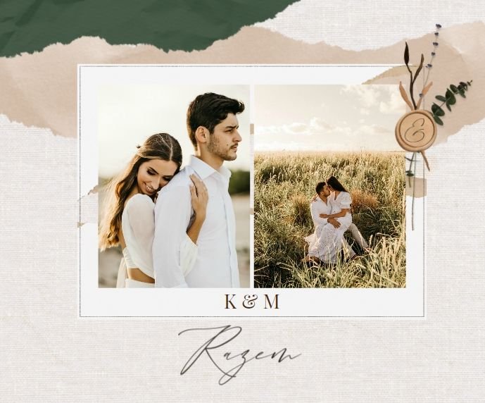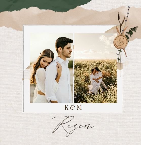 Fotoalbum "Ślub w plenerze" to propozycja dla osób ceniących delikatność, naturę i minimalizm. Kolory szablonu - beż, butelkowa zieleń i biel - idealnie pasują do fotografii ślubnych w stylu rustykalnym i boho. Strony przyozdobione zostały w subtelne elementy bliskie romantycznej naturze, takie jak skrawki papeterii, polne kwiatki oraz woskowe pieczęcie. Cienkie ramki okalające zdjęcia podkreślą ich elegancję. Czułe, krótkie teksty, nawiązujące do ważnych momentów każdego ślubu, na zawsze zapiszą najpiękniejsze wspomnienia z tego najważniejszego dnia.