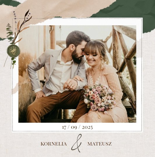 Fotoalbum "Ślub w plenerze" to propozycja dla osób ceniących delikatność, naturę i minimalizm. Kolory szablonu - beż, butelkowa zieleń i biel - idealnie pasują do fotografii ślubnych w stylu rustykalnym i boho. Strony przyozdobione zostały w subtelne elementy bliskie romantycznej naturze, takie jak skrawki papeterii, polne kwiatki oraz woskowe pieczęcie. Cienkie ramki okalające zdjęcia podkreślą ich elegancję. Czułe, krótkie teksty, nawiązujące do ważnych momentów każdego ślubu, na zawsze zapiszą najpiękniejsze wspomnienia z tego najważniejszego dnia.