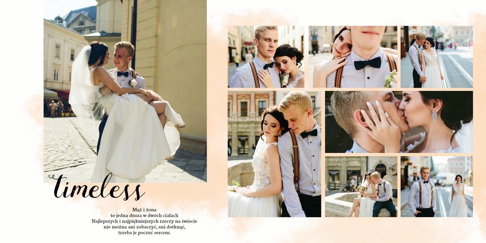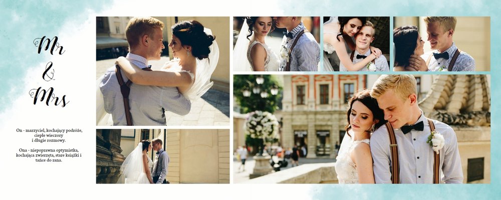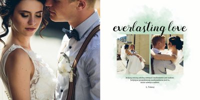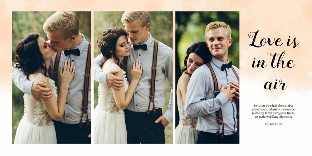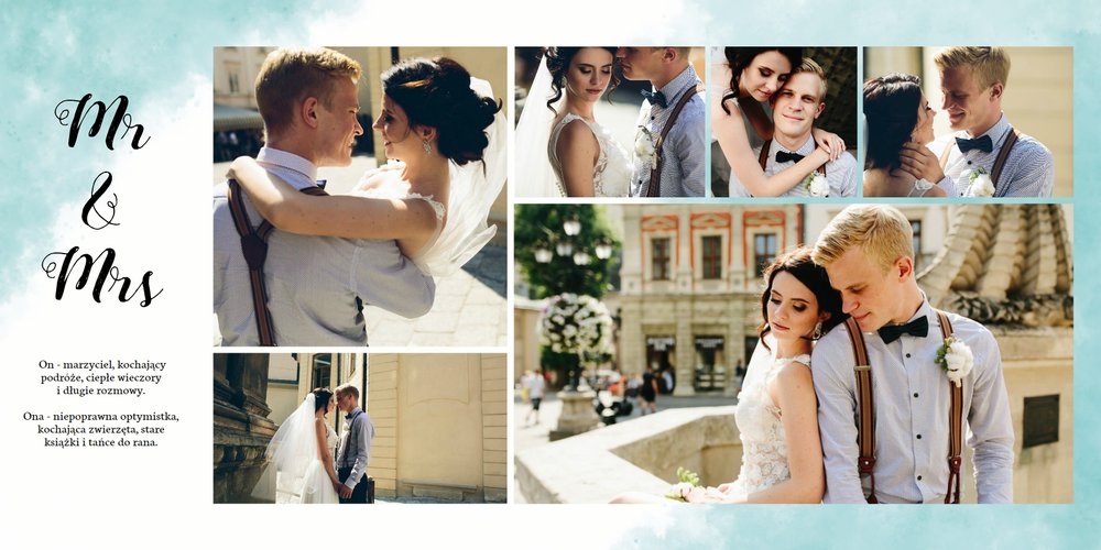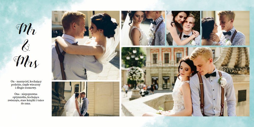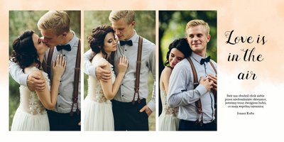 Fotoksiążka z szablonem Ślubna stanie się wyjątkową oprawą Waszych ślubnych zdjęć. Dzięki niemu wydrukujecie piękne wspomnienia z jednego z najważniejszych dni na Waszej wspólnej drodze życia. Estetyczny, prosty układ oraz delikatne, pastelowe akcenty kolorystyczne, będą idealnie komponować się z Waszymi zdjęciami. Zaprojektowanie Waszej ślubnej fotoksiążki z tym szablonem będzie prawdziwą przyjemnością, stwórzcie pamiątkę, która zostanie z Wami na lata.