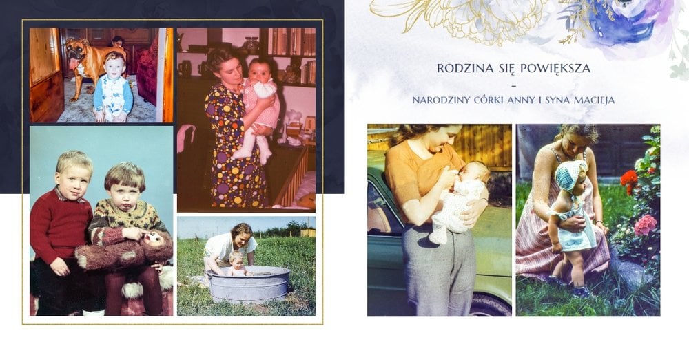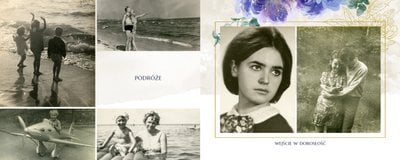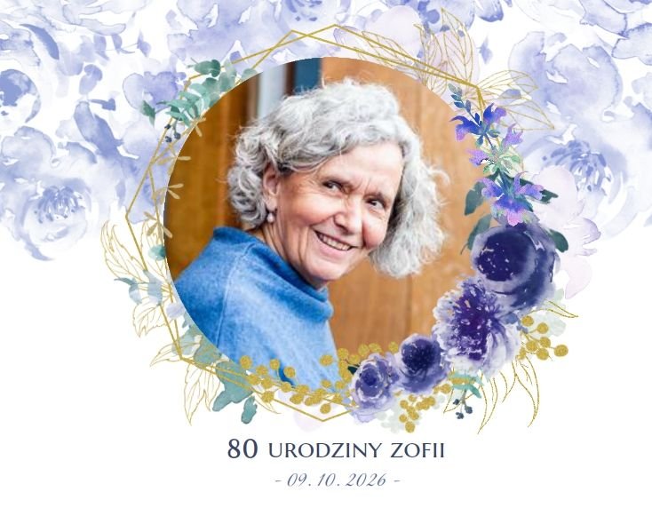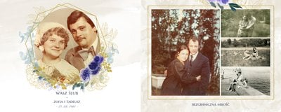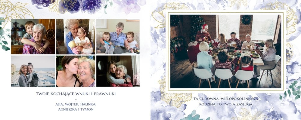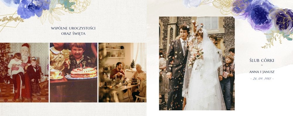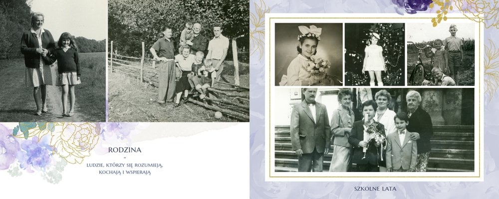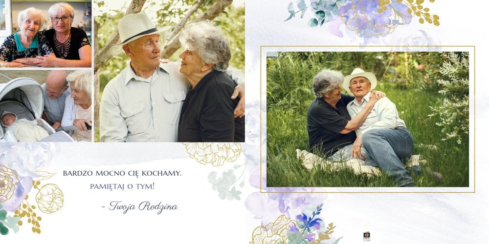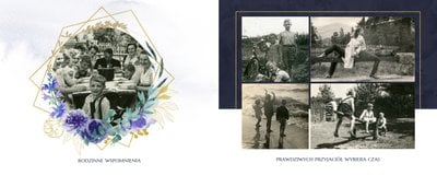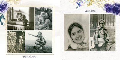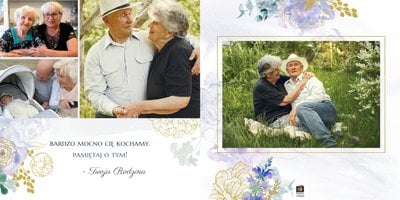 Motywem przewodnim szablonu "Urodziny seniora" są szafirowe kwiaty. Lekkości dodają złote zdobienia i pełne uznania wzruszające teksty. Całość tworzy bogate uzupełnienie komórek, w których można umieścić skany fotografii sprzed lat i aktualne zdjęcia.