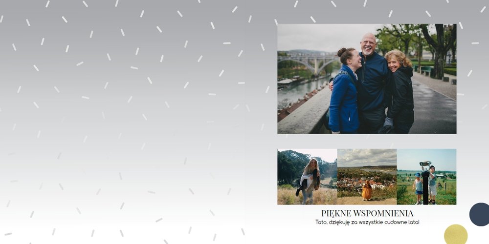 Czerwiec to miesiąc świętowania dla wszystkich Ojców, dlatego z tej okazji przygotowaliśmy szablon W dniu Taty. Z jego pomocą wyrazisz w prosty sposób to, co najtrudniejsze - miłość, wyrazy wdzięczności i podziękowania za wspólne przeżycia. Dzięki temu nowoczesnemu, a jednocześnie eleganckiemu szablonowi zdjęcia Taty nabiorą wdzięku sprawią mu wiele radości w trakcie przeglądania. Decydując się na prezent w formie fotoksiążki masz pewność, że uchwycisz wszystkie chwile z Tatą w jednym miejscu i zadbasz o rodzinne wspomnienia na długie, długie lata. Wewnątrz szablonu znajdziesz białe tła oraz motywy graficzne w odcieniach granatu, szarości i złota - całość tworzy uniwersalny pomysł na prezent dla Taty.