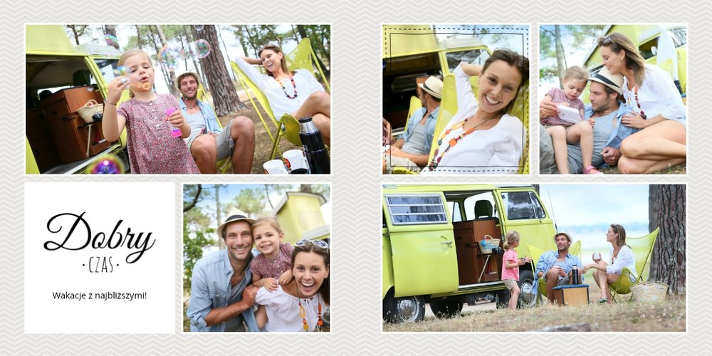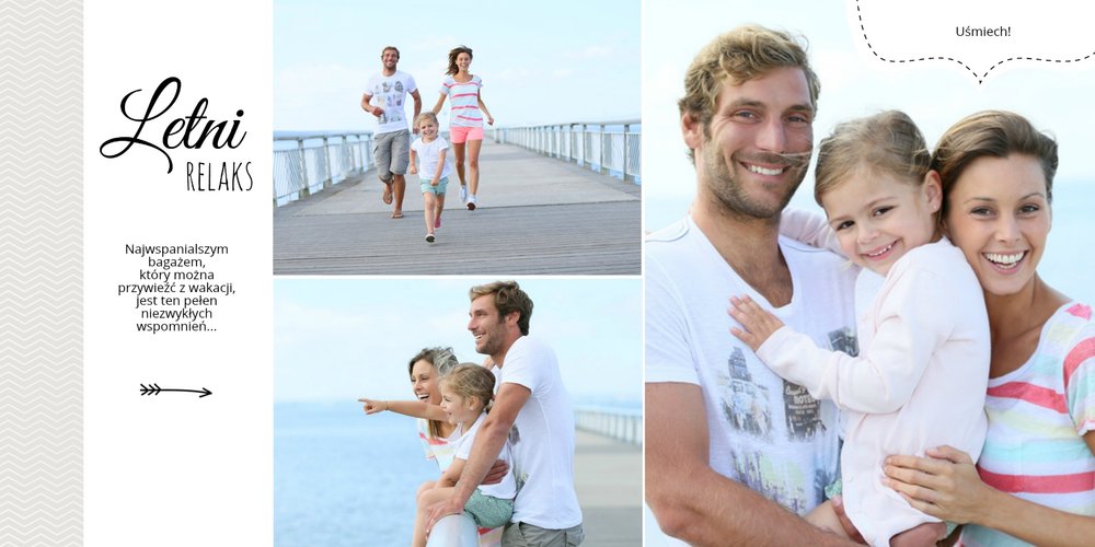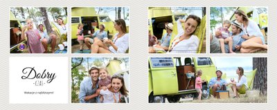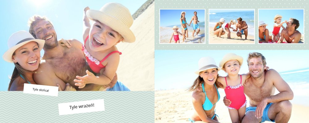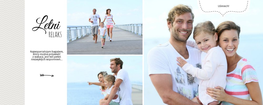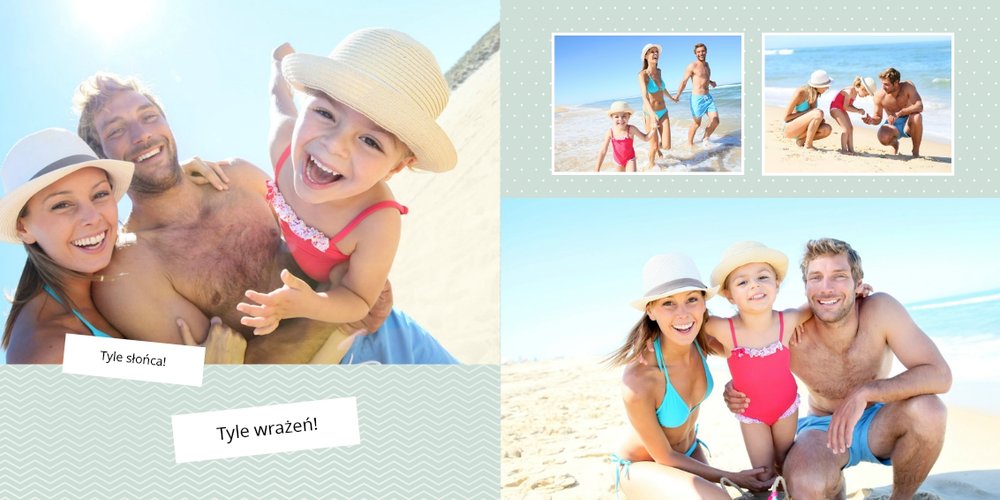 Z szablonem Wakacje w Polsce stworzysz wyjątkowy fotoalbum pełną letnich wspomnień z wakacji nad morzem lub z weekendu w górach. To idealny szablon dla miłośników podróży po Polsce, po takich miejscach jak polskie góry, Morze Bałtyckie, Mazury. Popielate i beżowe tła świetnie komponują się z kolorowymi zdjęciami. Ciekawe czcionki, różnorodne układy zdjęć oraz miejsca na własne teksty, dodatkowo urozmaicą wakacyjny fotoalbum. Z tym szablonem zaprojektujesz wyjątkową książkę, która będzie piękną pamiątką na całe życie!