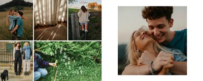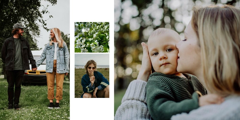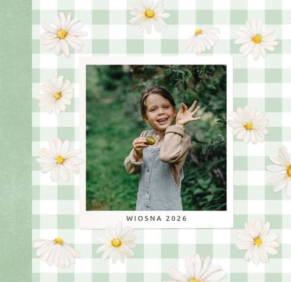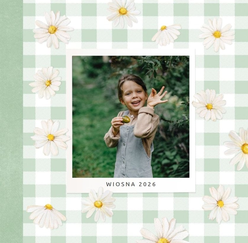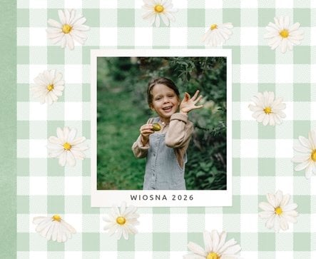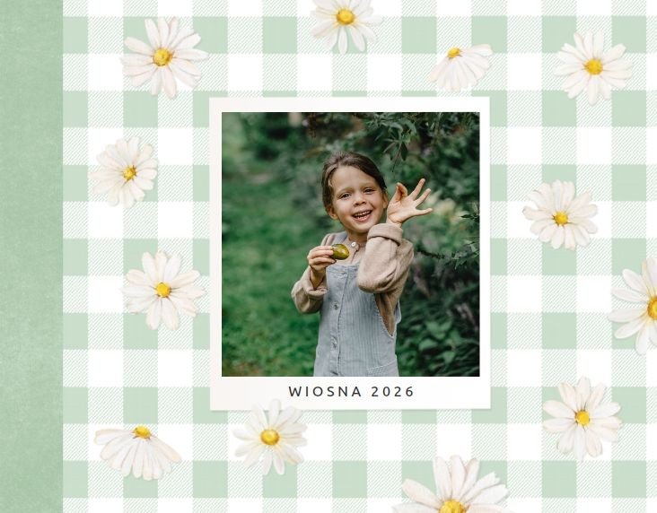 Serię rozpoczynamy z szablonem fotoalbumu "Wiosenny album na zdjęcia". Wiosna to czas, w którym wszystko budzi się do życia, a dni stają się coraz cieplejsze. Inspirowana porą roku okładka szablonu nawiązuje do widoku zielonej łąki, kwiatów wpinanych we włosy i wiejskiej sielanki. Motywy przewodnie szablonu to kolor szałwiowy, kratka i stokrotki, które idealnie podkreślają wszystkie cechy wiosny i wprowadzają w marzycielski nastrój. W środku szablonu znajdują się minimalistyczne układy zdjęciowe, które dzięki swojej prostocie pomagają zaprojektować fotoalbum w szybki sposób.