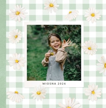 Serię rozpoczynamy z szablonem fotoalbumu "Wiosenny album na zdjęcia". Wiosna to czas, w którym wszystko budzi się do życia, a dni stają się coraz cieplejsze. Inspirowana porą roku okładka szablonu nawiązuje do widoku zielonej łąki, kwiatów wpinanych we włosy i wiejskiej sielanki. Motywy przewodnie szablonu to kolor szałwiowy, kratka i stokrotki, które idealnie podkreślają wszystkie cechy wiosny i wprowadzają w marzycielski nastrój. W środku szablonu znajdują się minimalistyczne układy zdjęciowe, które dzięki swojej prostocie pomagają zaprojektować fotoalbum w szybki sposób.