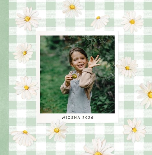 Serię rozpoczynamy z szablonem fotoalbumu "Wiosenny album na zdjęcia". Wiosna to czas, w którym wszystko budzi się do życia, a dni stają się coraz cieplejsze. Inspirowana porą roku okładka szablonu nawiązuje do widoku zielonej łąki, kwiatów wpinanych we włosy i wiejskiej sielanki. Motywy przewodnie szablonu to kolor szałwiowy, kratka i stokrotki, które idealnie podkreślają wszystkie cechy wiosny i wprowadzają w marzycielski nastrój. W środku szablonu znajdują się minimalistyczne układy zdjęciowe, które dzięki swojej prostocie pomagają zaprojektować fotoalbum w szybki sposób.