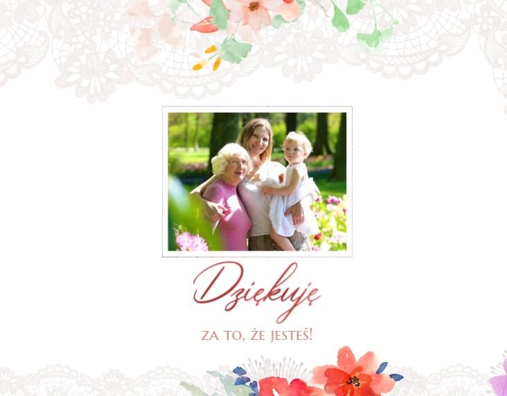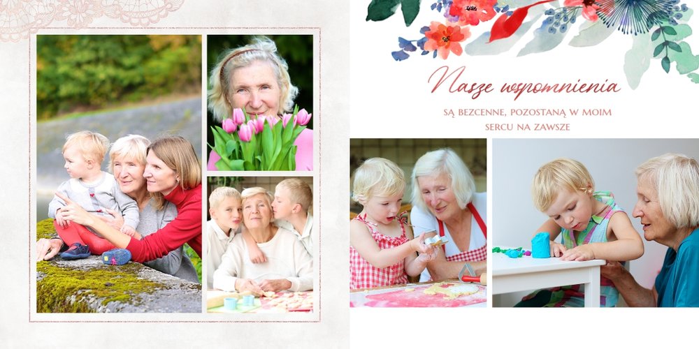 Wnętrze szablonu wypełniają koronkowe motywy oraz kolorowe kwiaty. Dodaje to lekkości i sprawia, że fotoalbum wypełniony najzwyklejszymi zdjęciami, będzie niezwykłą pamiątką i idealnym prezentem, do którego Babcia będzie powracała z uśmiechem.