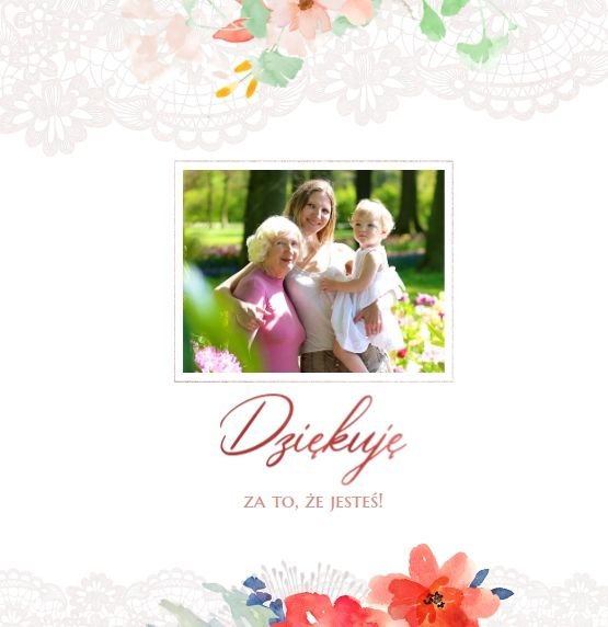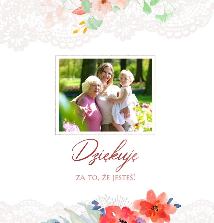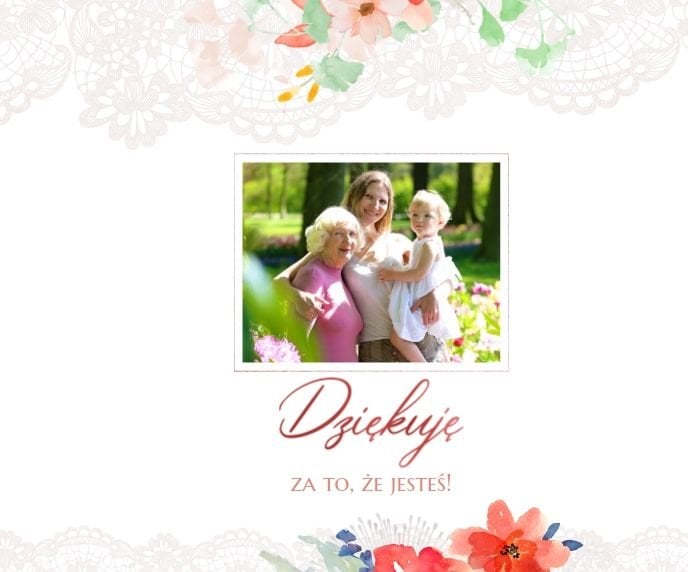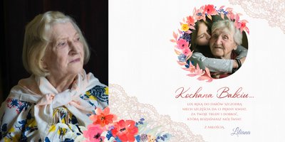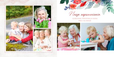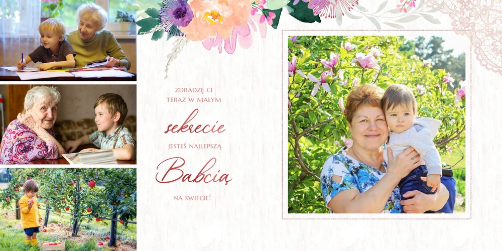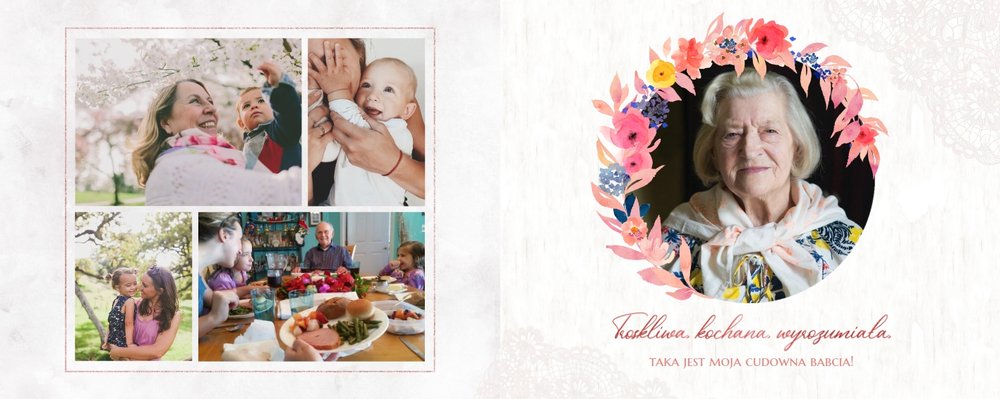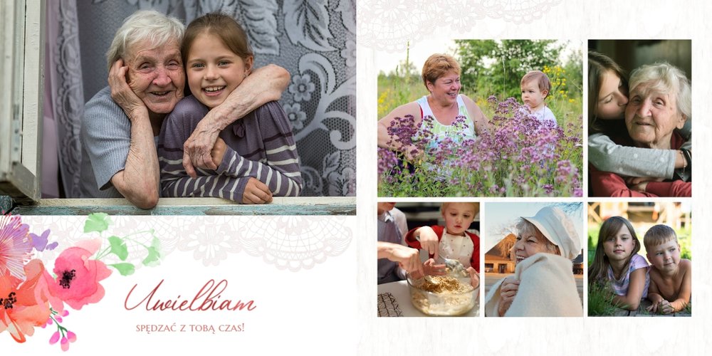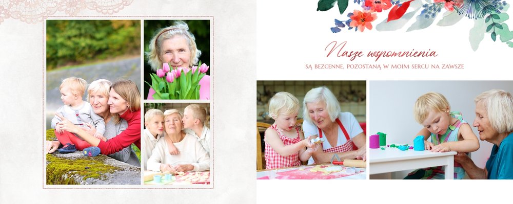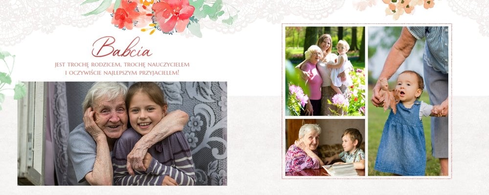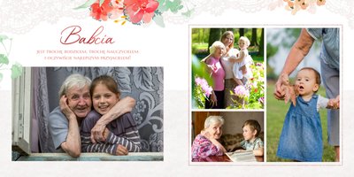 Wnętrze szablonu wypełniają koronkowe motywy oraz kolorowe kwiaty. Dodaje to lekkości i sprawia, że fotoalbum wypełniony najzwyklejszymi zdjęciami, będzie niezwykłą pamiątką i idealnym prezentem, do którego Babcia będzie powracała z uśmiechem.