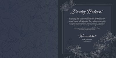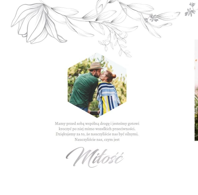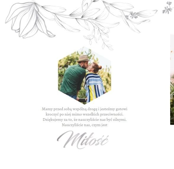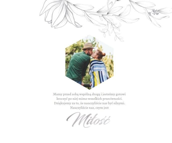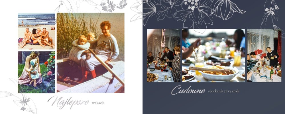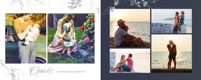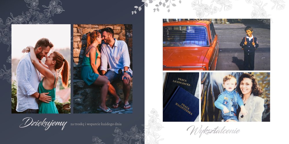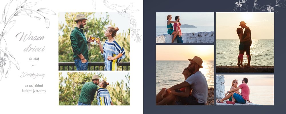 Dzień Waszego ślubu to jeden z najważniejszych dni w życiu! Jednak tego dnia należy także pamiętać o Rodzicach i podziękować im za troskę, miłość, zrozumienie i wsparcie w trudnych chwilach. Nawet nie zdajesz sobie sprawy, jak wielką przyjemność sprawisz im tego dnia, wręczając tak wzruszający prezent. Szablon Z miłości do Rodziców zapewni Ci elegancki wygląd, który idealnie sprawdzi się jako tło dla Twoich zdjęć. Mnóstwo miejsca zapewnią Ci ramki, w których umieścić może zdjęcia z Waszego dzieciństwa lub fotografie z przeszłości Waszych Rodziców. To jak będzie wyglądał fotoalbum wewnątrz zależy wyłącznie od Ciebie.