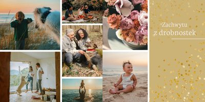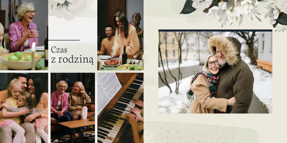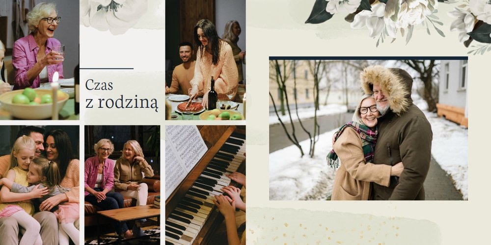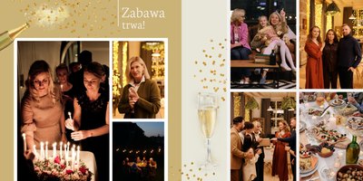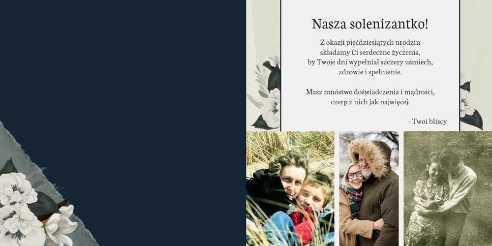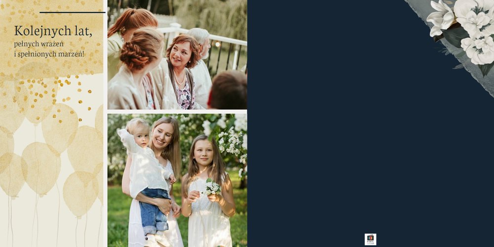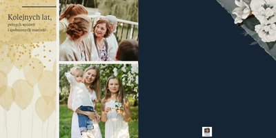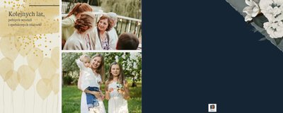 W szablonie dominują odcienie zieleni, beżu i granatu. Niezwykłości dodają złote, subtelne dodatki, które nie dają zapomnieć jakiej okazji pamiątka dotyczy. Kwiatowe wzory zdobią bezcenne fotografie i dodają kobiecości projektowi. Każda strona fotoalbumu "Z okazji 50 urodzin" posiada miejsca na cudowne chwile z życia solenizantki - te spędzone z rodziną czy przyjaciółmi. Możesz skorzystać z propozycji gotowego szablonu, zyskując w kilka chwil oryginalny prezent lub każdą stronę dostosować do własnych potrzeb - zmieniając teksty, układ elementów, czy wielkość i ilość komórek zdjęciowych.