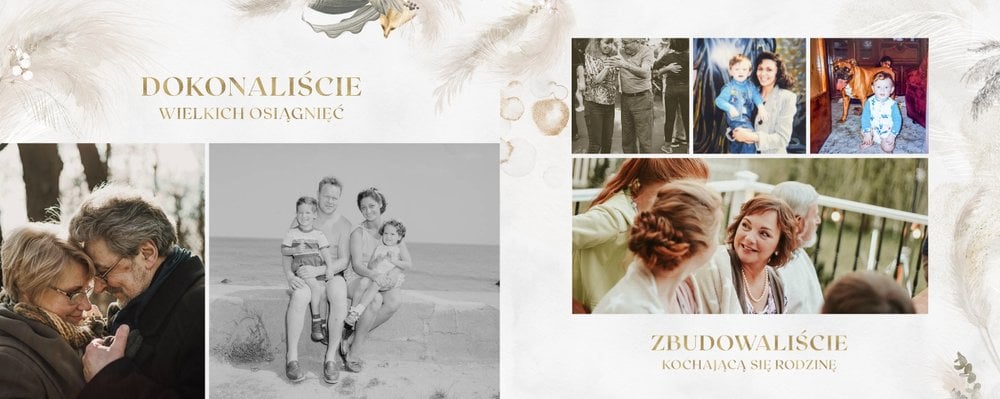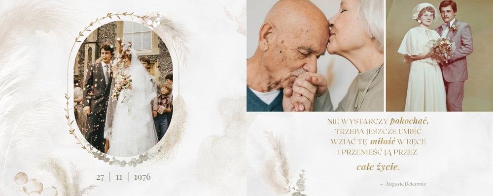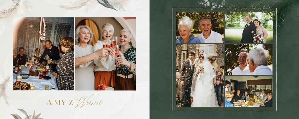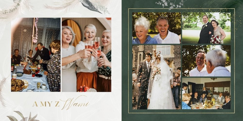 Fotoalbum z szablonem "Złote gody" to wzruszający zbiór wspomnień, który przypomni o najpiękniejszych chwilach. Wystarczy, że wypełnisz komórki zdjęciowe obecnymi fotografiami najbliższych, ale i zeskanowanymi zdjęciami sprzed lat. Ich dopełnienie będą stanowić gotowe teksty, życzenia i sentencje, które z pewnością wywołają masę wzruszeń.