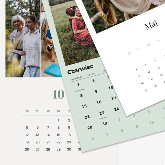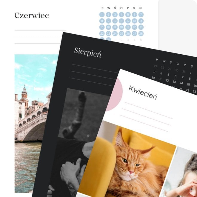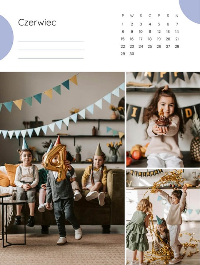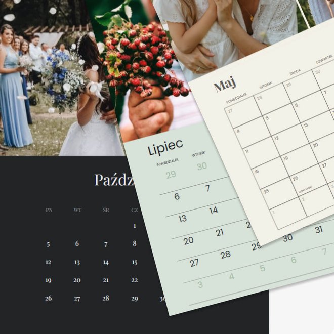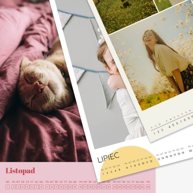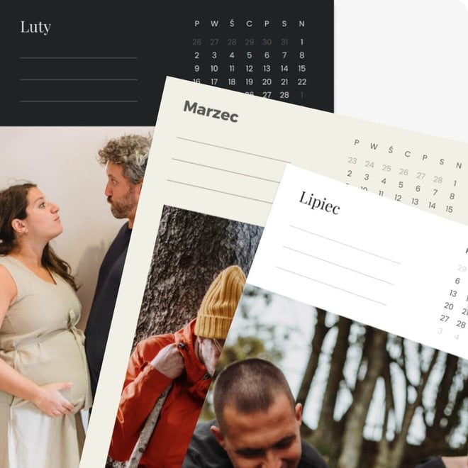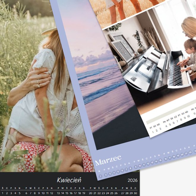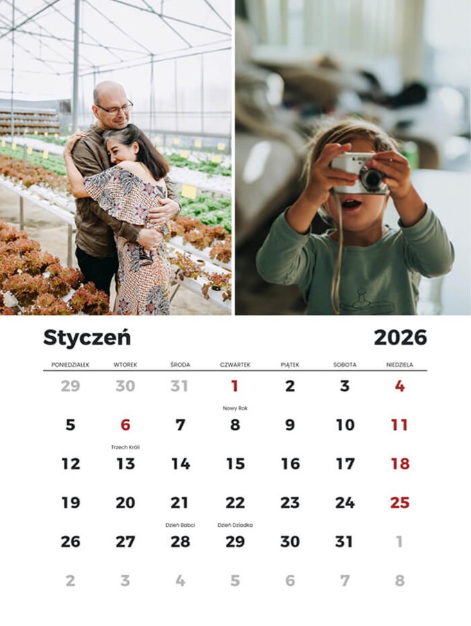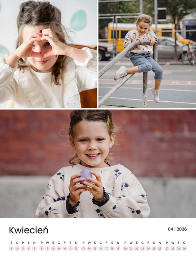 Przygotowaliśmy gotowe układy, które pomieszczą od 1 do 6 zdjęć na każdej karcie kalendarza.
