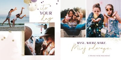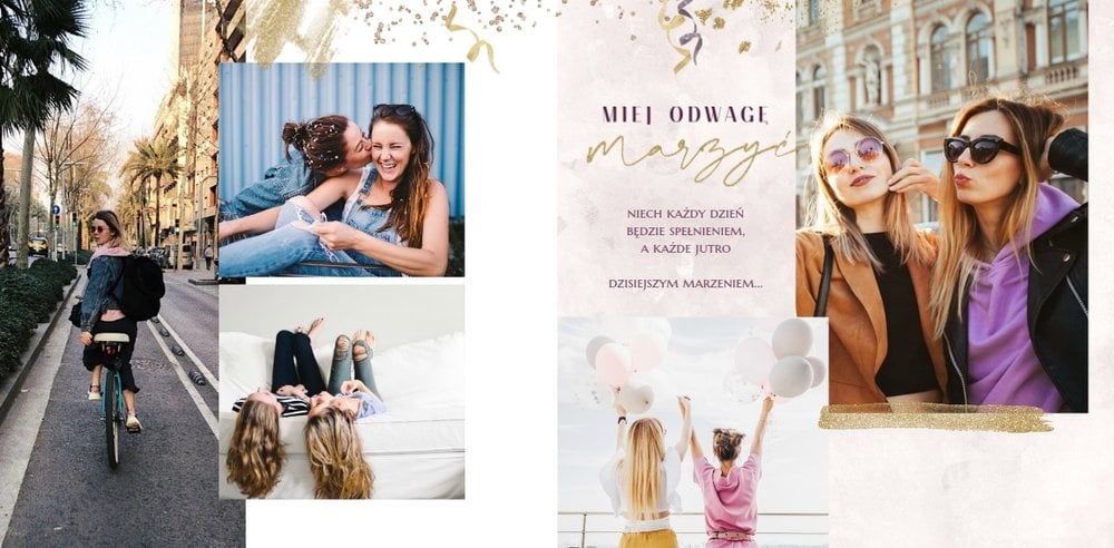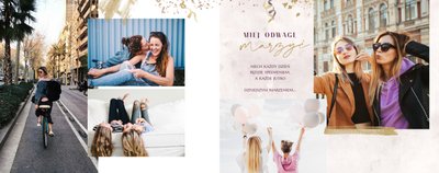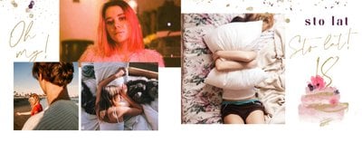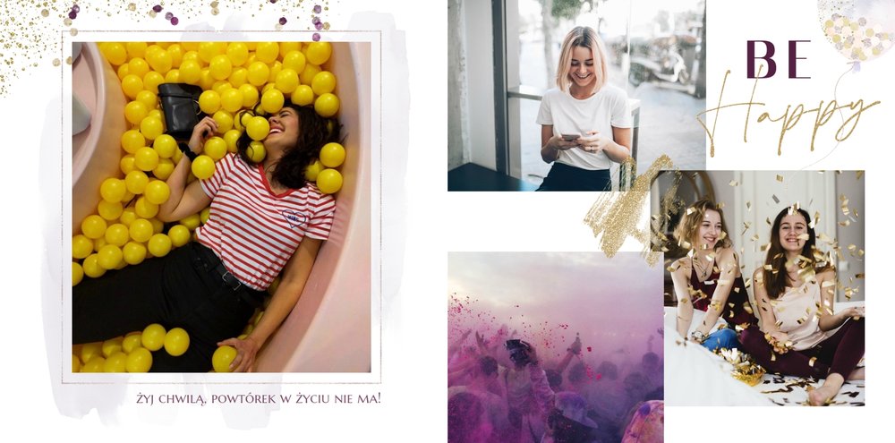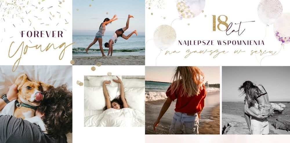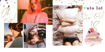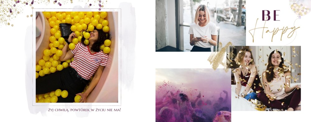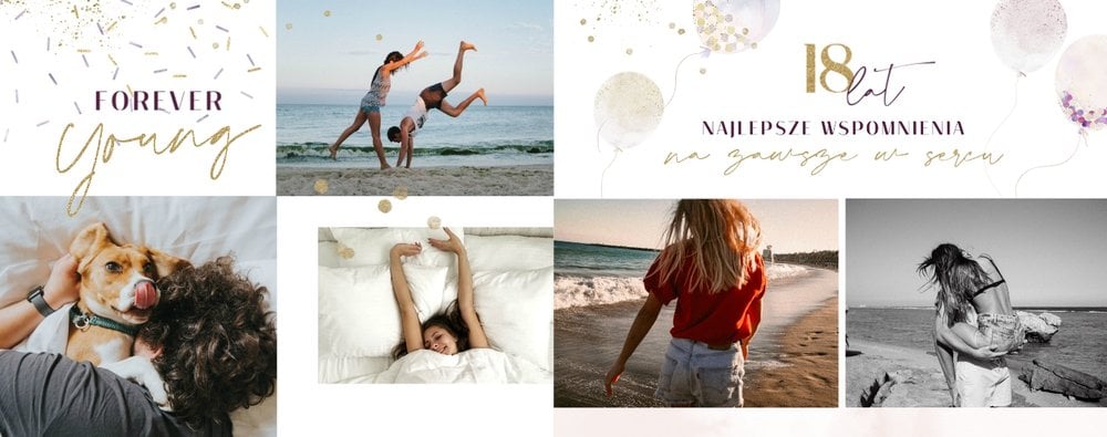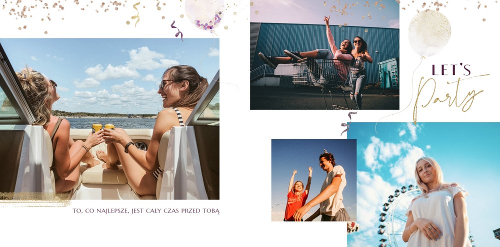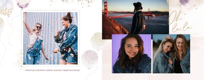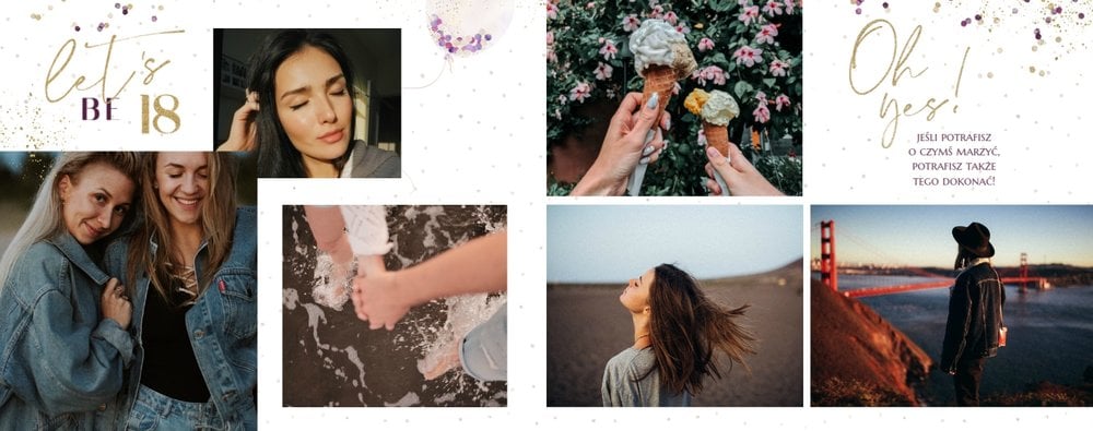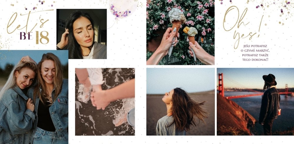 Szablon "18 lat minęło" to propozycja prezentowa pełna odcieni fioletów, złota oraz srebra. Kolory te są motywem przewodnim tego szablonu. Wewnątrz znajdziesz także urodzinowe elementy graficzne, złote napisy, a także nietypowe układy zdjęć.