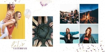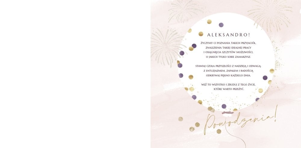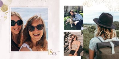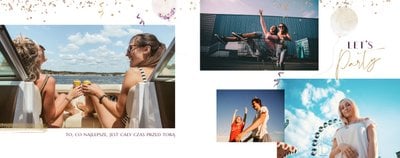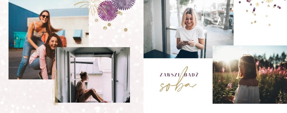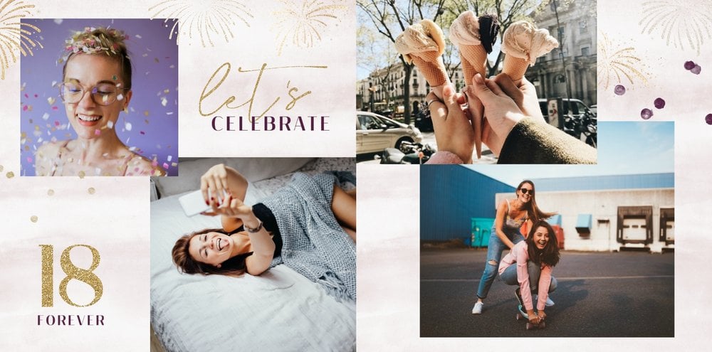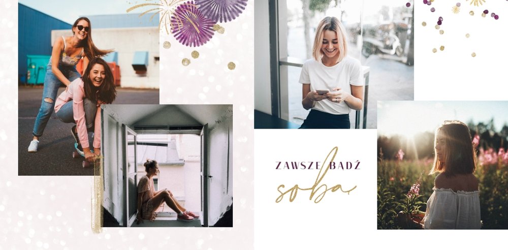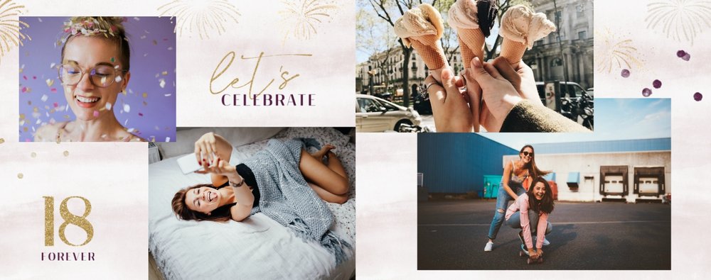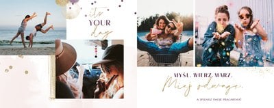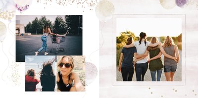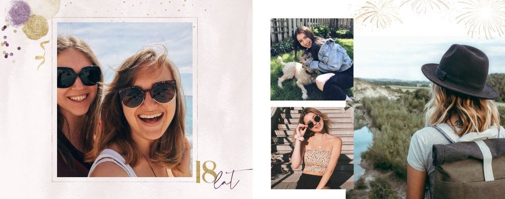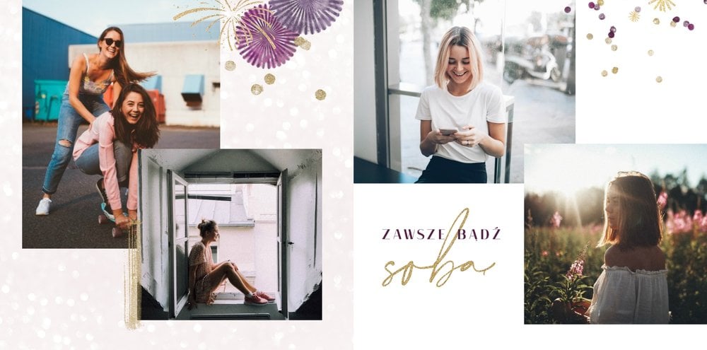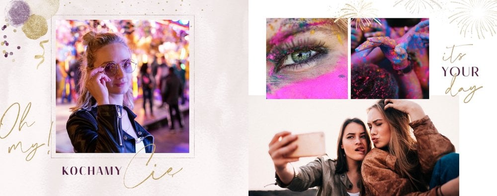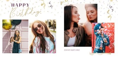 Szablon "18 lat minęło" to propozycja prezentowa pełna odcieni fioletów, złota oraz srebra. Kolory te są motywem przewodnim tego szablonu. Wewnątrz znajdziesz także urodzinowe elementy graficzne, złote napisy, a także nietypowe układy zdjęć.